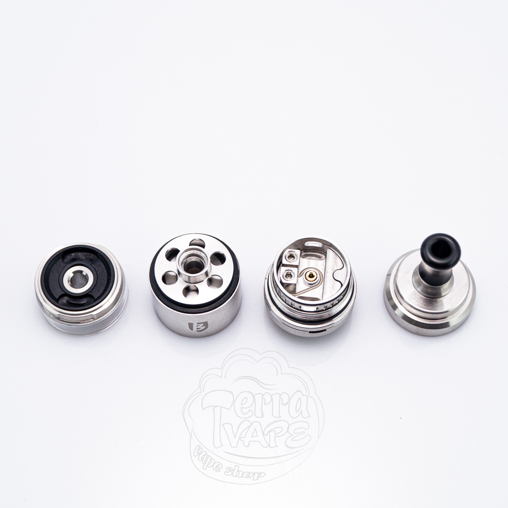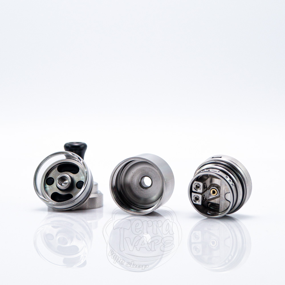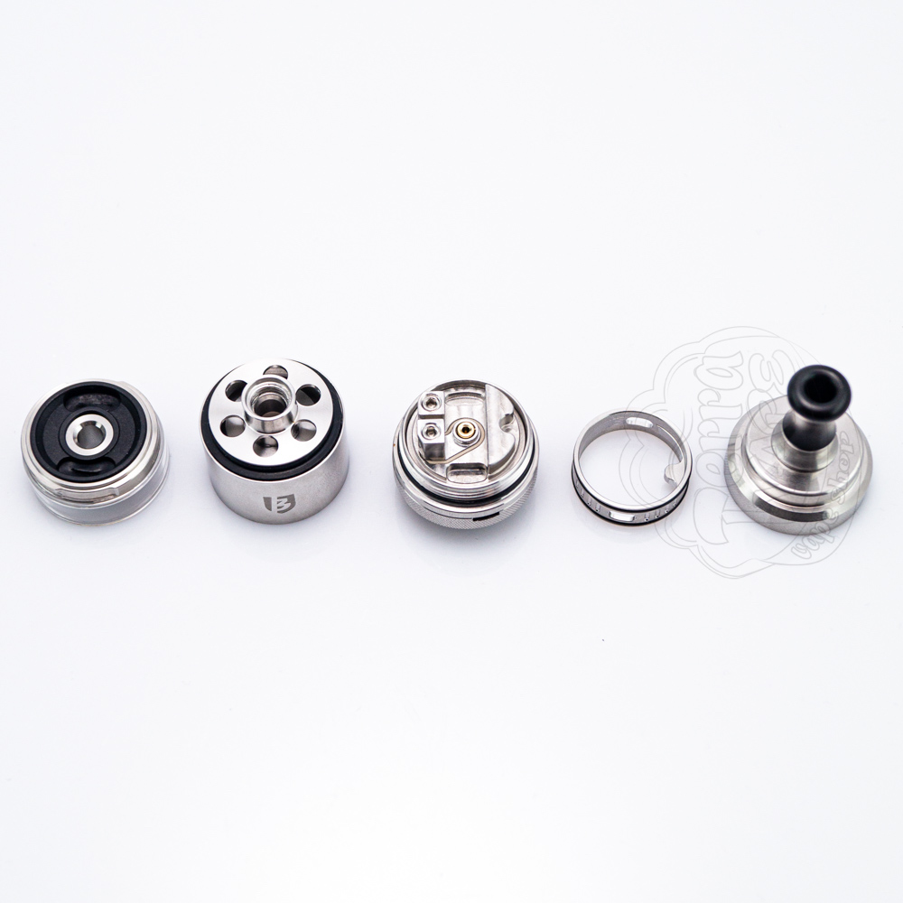 З комплекту ви отримаєте декілька наборів, серед яких знайдете необхідні запчастини, спіралі, жиклери та декілька варіантів дріп-типів. Така увага виробника до дрібниць відображає прагнення забезпечити комплексний та зручний для користувача набір. Мундштуки мають невеликий діаметр, щоб максимально розкрити відчуття від MTL вейпінгу. Їхньою перевагою є те, що складаються вони з двох частин (адаптер та сам дріп-тип). Це означає, що якщо жоден з представлених варіантів вам не сподобається, ви зможете від'єднати адаптер та вміщати стандартні 510 мундштуки. Верхня кришка з накаткою відкручується в чверть оберту та відкриває доступ до заправних отворів.
