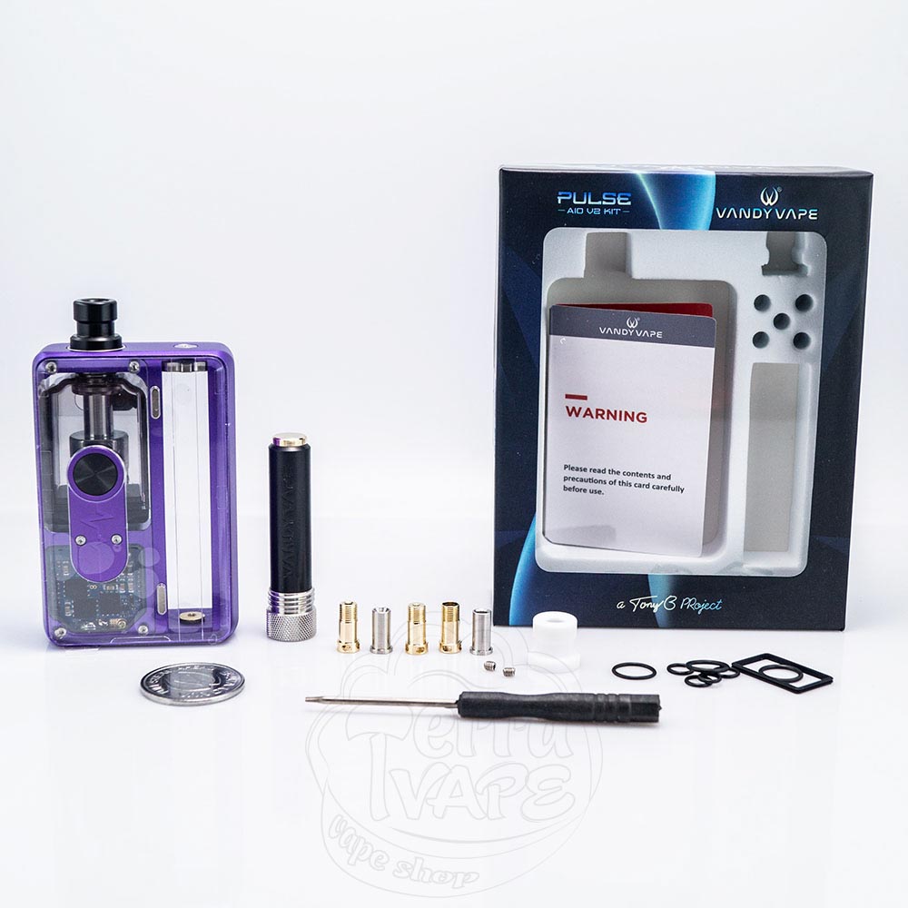 Vandy Vape Pulse AIO v2 - це оновлена версія електронної сигарети все-в-одному Pulse AIO, яку випустила компанія Vandy Vape у співпраці з Tony B. Вейп працює з одним змінним акумулятором формату 18650 (не входить до комплекту) та здатен видавати максимальну потужність 80W.Разом з пристроєм постачається бачок з обслуговуваною RBA базою, резервуар якого вміщує близько 6мл рідини. Приємним бонусом до набору ви отримуєте 510 адаптер, завдяки якому зникає необхідність у додаткових пристроях для пропалювання, що робить процес обслуговування набагато зручнішим.