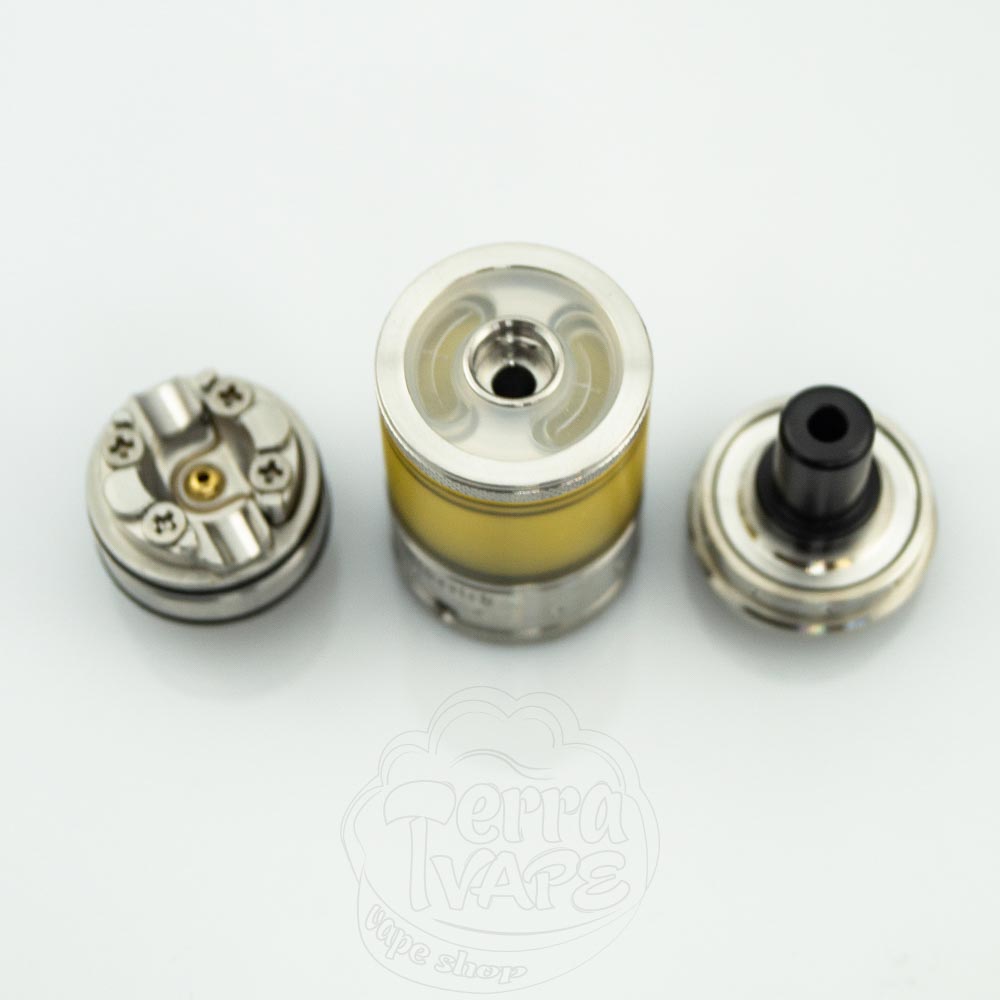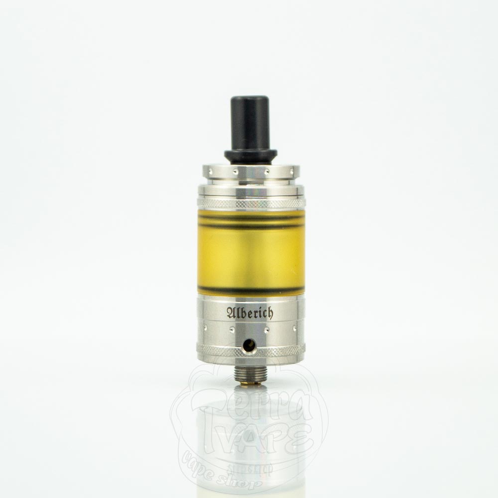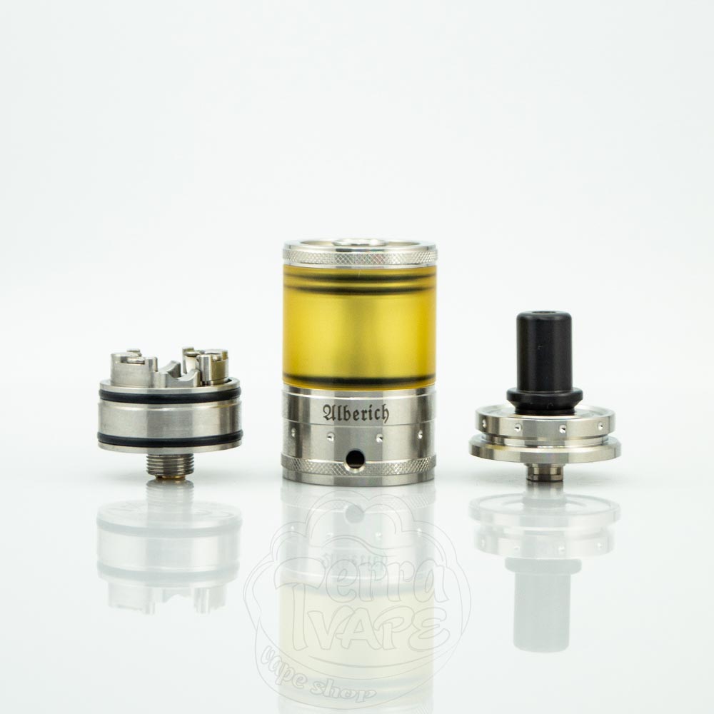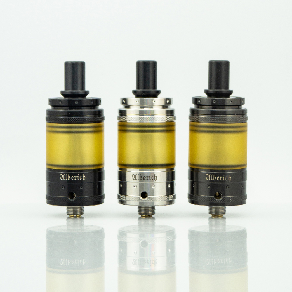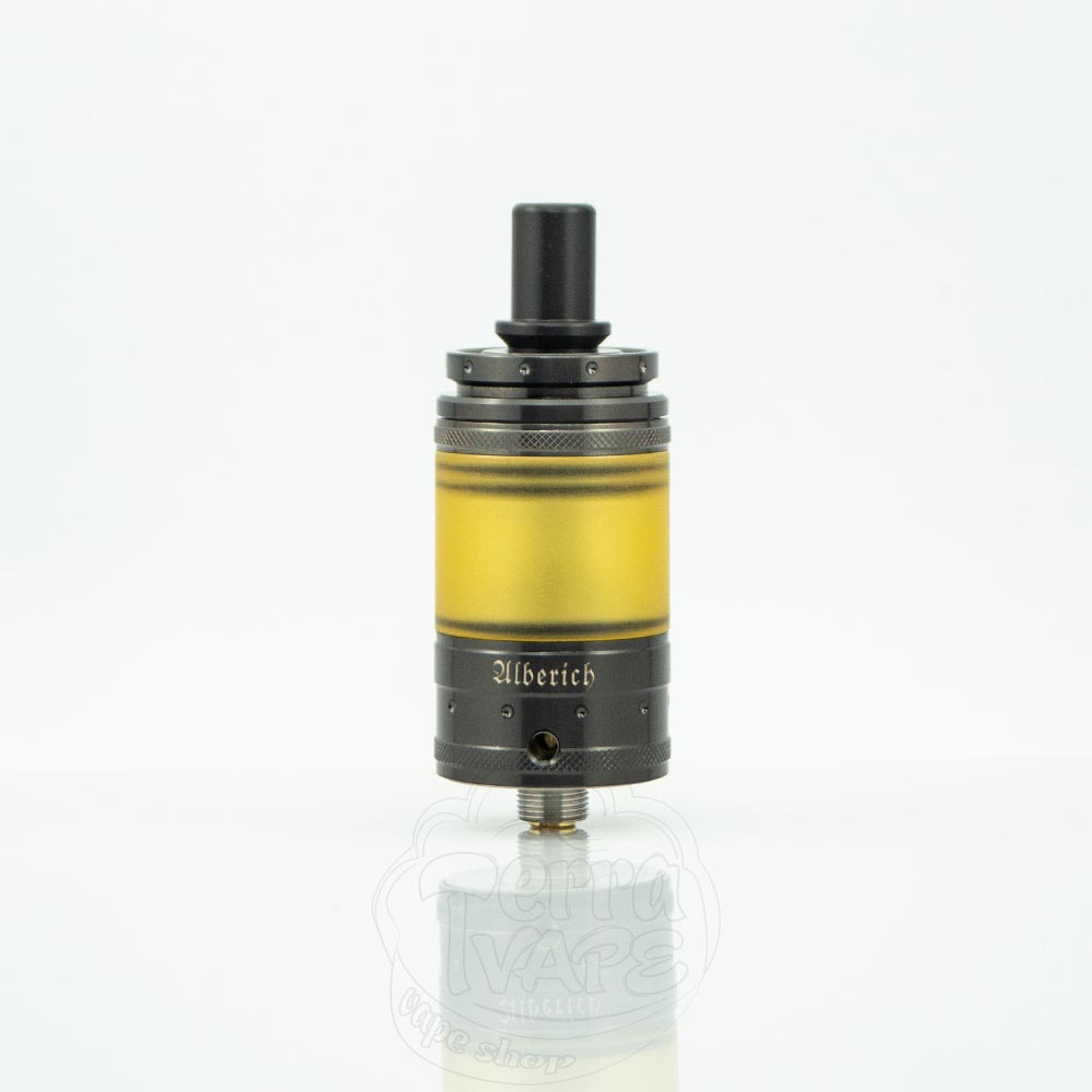 Vapefly Alberich MTL RTA – обслжуиваемый бак на одну спираль под сигаретную затяжку от компании Vapefly. Диаметр базы составляет 22мм, а объем может быть 3мл или 4 мл, в зависимости от используемой секции резервуара. Вверху расположился сменный о-ринговый 510 дрип-тип. Реализована интересная система подачи жидкости сверху, путем «прокапывания» через специальные отверстия на куполе. Процесс обслуживания прост и удобен настолько, что справится даже новичок в мире ребилдинга.