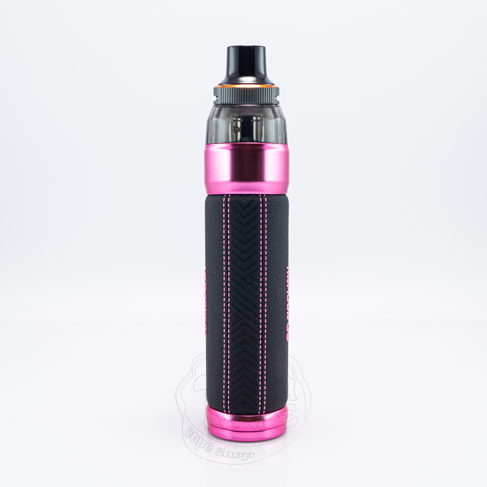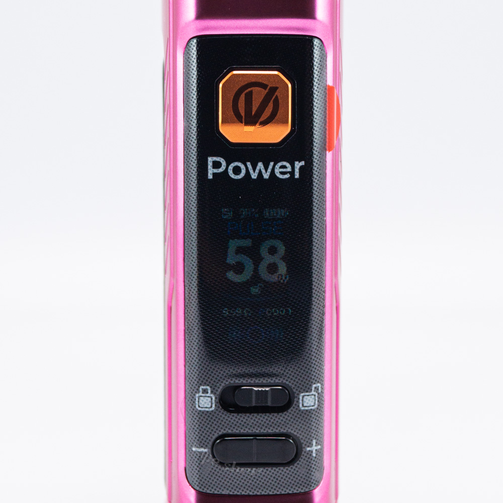 На лицевій стороні знаходиться продовгувата чорна панель із закругленими кутами. На ній розташовуються абсолютно всі елементи управління. У верхній частині є кнопка активації зручної форми, одразу під нею розмістився яскравий TFT-дисплей діагоналлю 0.96``. Нижче можна побачити перемикач блокування та дві маленькі кнопки для навігації. У нижній частині електронної сигарети знаходиться зарядний порт Туре-С.