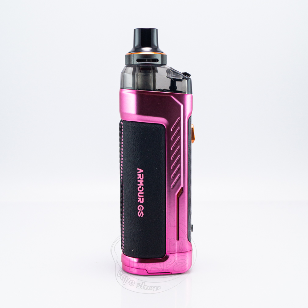 Вірогідно, якщо озвучити слово "под-мод", то користувачі, які хоч колись у житті бачили цей тип пристроїв, уявлятимуть собі приблизно той самий форм-фактор, який має Armour GS. Це овальна основа, яка має доволі невелику висоту, щоб зручно поміщатися в руку. Корпус виготовляється з двох різних матеріалів, які створюють між собою привабливий контраст. Передня частина вейпа являє собою металевий каркас. Він має доволі багато дрібних елементів, які створюють повноту дизайну, а також додають пристрою об'єму при цьому зберігаючи ергономічність. Ззаду та по боках розміщується шкіряна накладка, яка додає зовнішньому вигляду м'якості та сучасності.