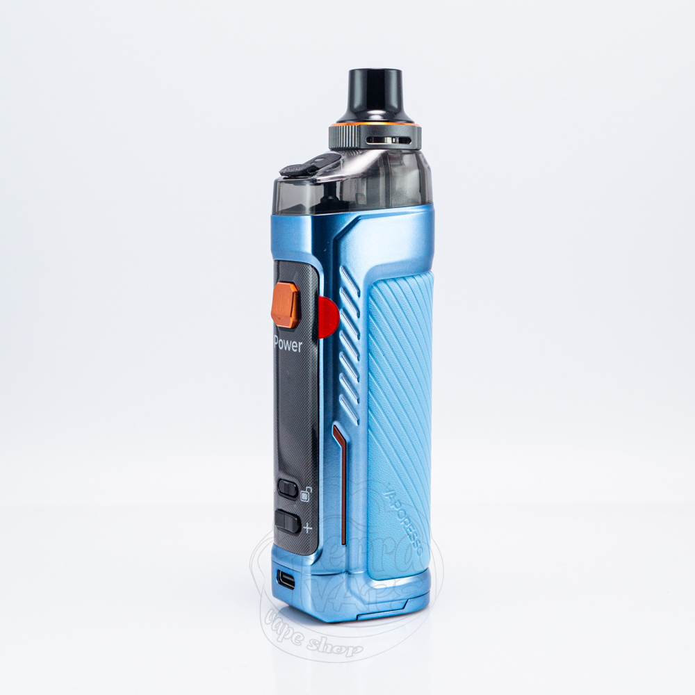 Vaporesso Armour GS Pod Mod Kit 80W Blue - це pod-мод блакитного кольору від відомої у галузі вейпінгу компанії Vaporesso. Він підтримує потужність до 80W, а живлення забезпечує змінний акумулятор формату 18650, який потрібно купляти окремо від пристрою. За активацію відповідає кнопка. На корпусі присутній великий 0.96-дюймовий екран, за допомогою якого ви зможете зручно проводити налаштування вашої електронної сигарети.