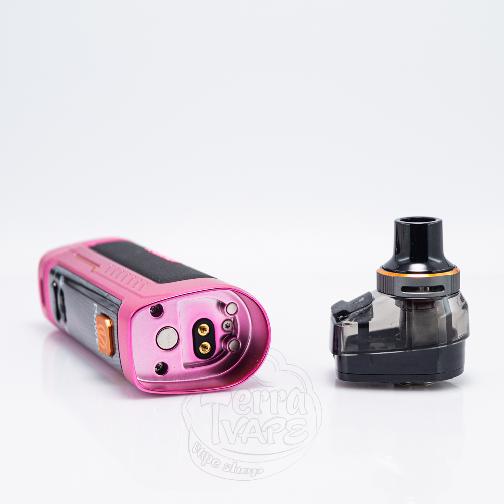 На лицевій стороні знаходиться продовгувата чорна панель із закругленими кутами. На ній розташовуються абсолютно всі елементи управління. У верхній частині є кнопка активації зручної форми, одразу під нею розмістився яскравий TFT-дисплей діагоналлю 0.96``. Нижче можна побачити перемикач блокування та дві маленькі кнопки для навігації. У нижній частині електронної сигарети знаходиться зарядний порт Туре-С.