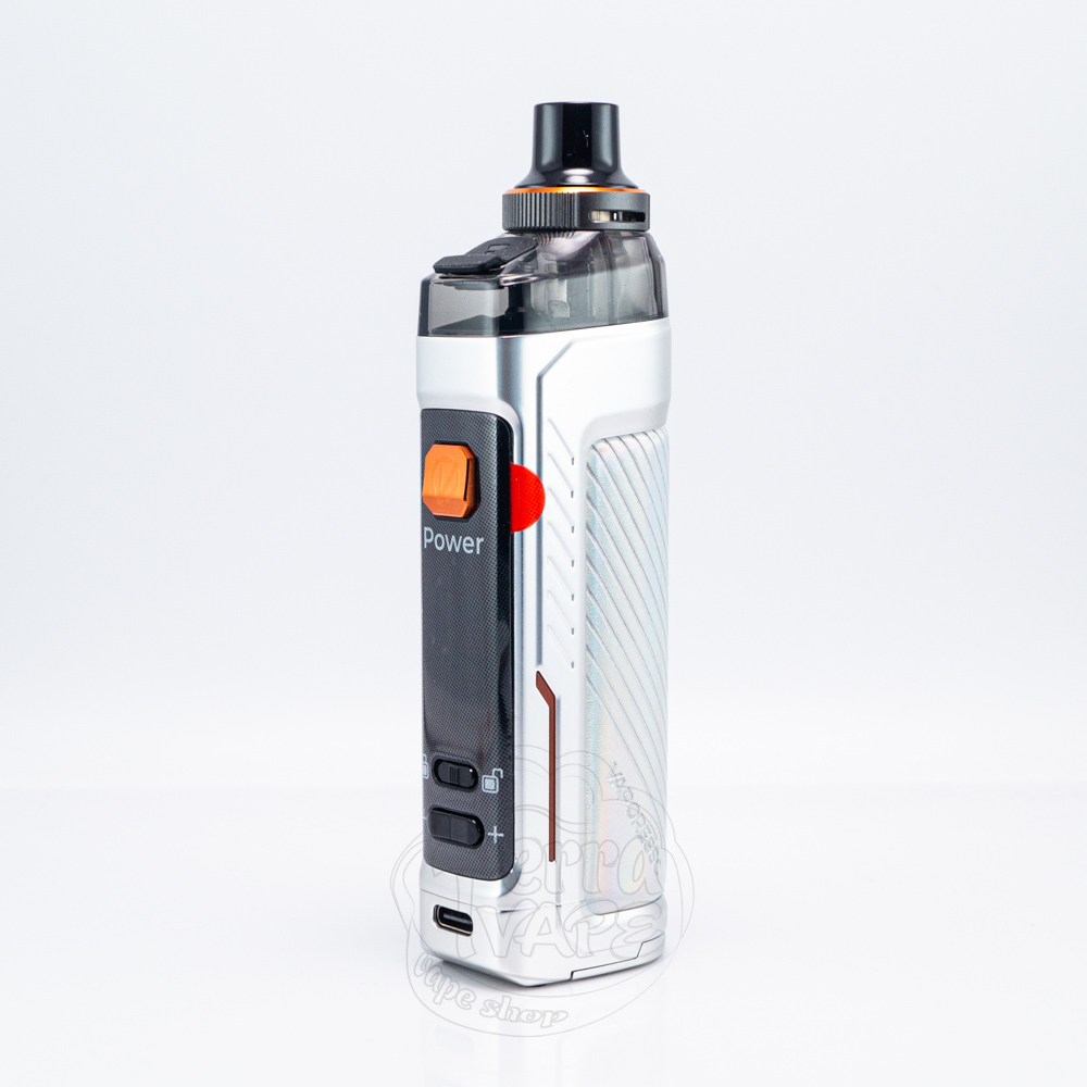 На лицевій стороні знаходиться продовгувата чорна панель із закругленими кутами. На ній розташовуються абсолютно всі елементи управління. У верхній частині є кнопка активації зручної форми, одразу під нею розмістився яскравий TFT-дисплей діагоналлю 0.96``. Нижче можна побачити перемикач блокування та дві маленькі кнопки для навігації. У нижній частині електронної сигарети знаходиться зарядний порт Туре-С.