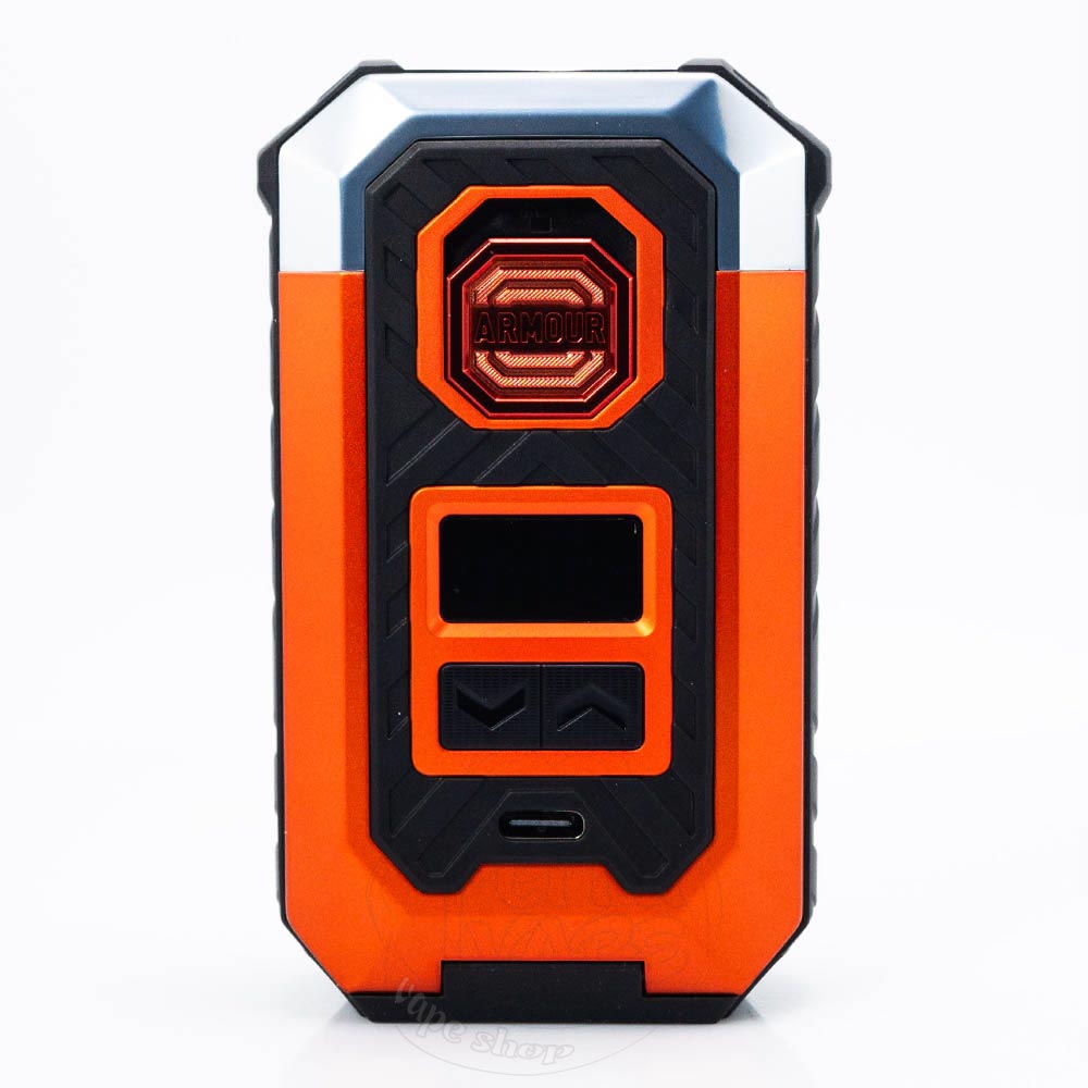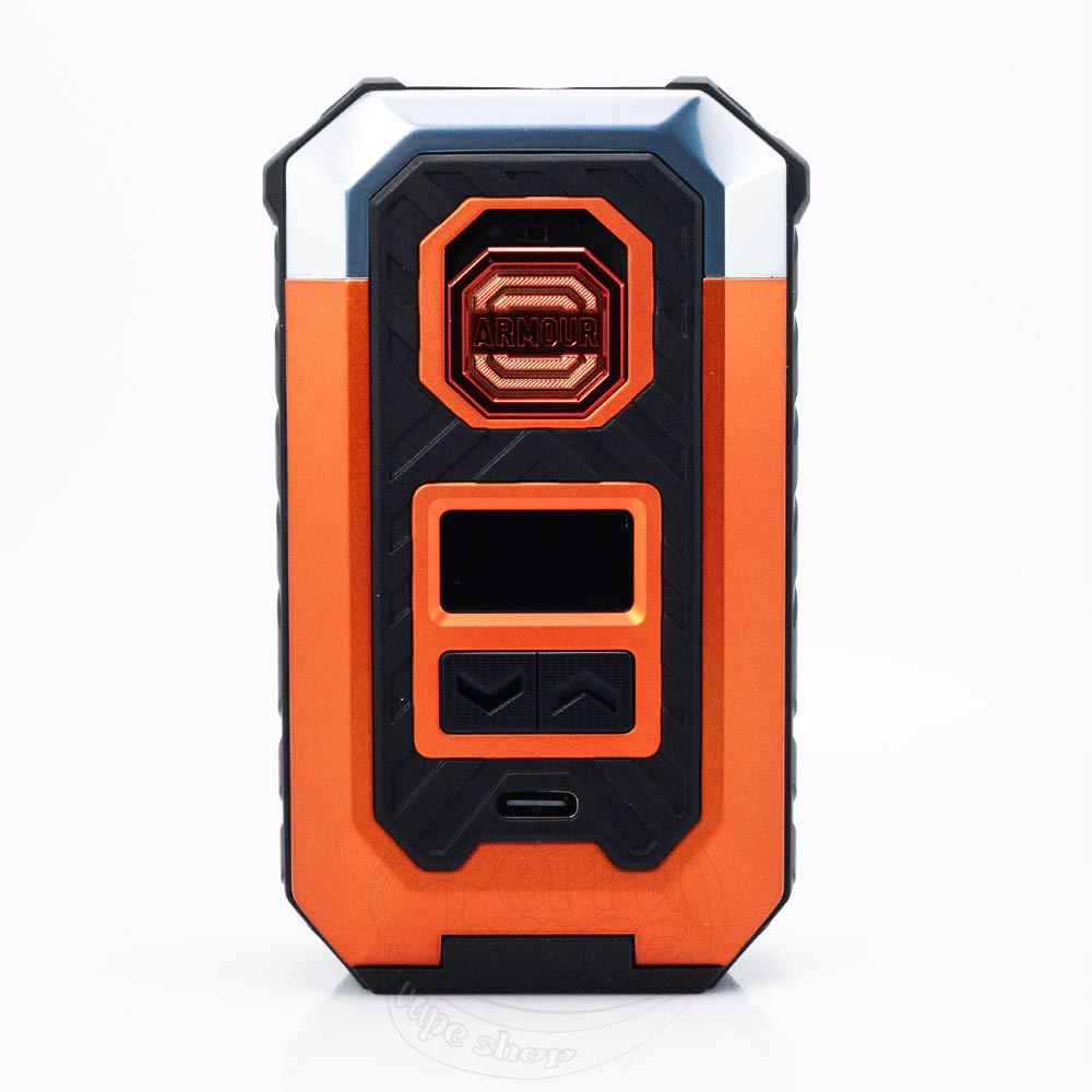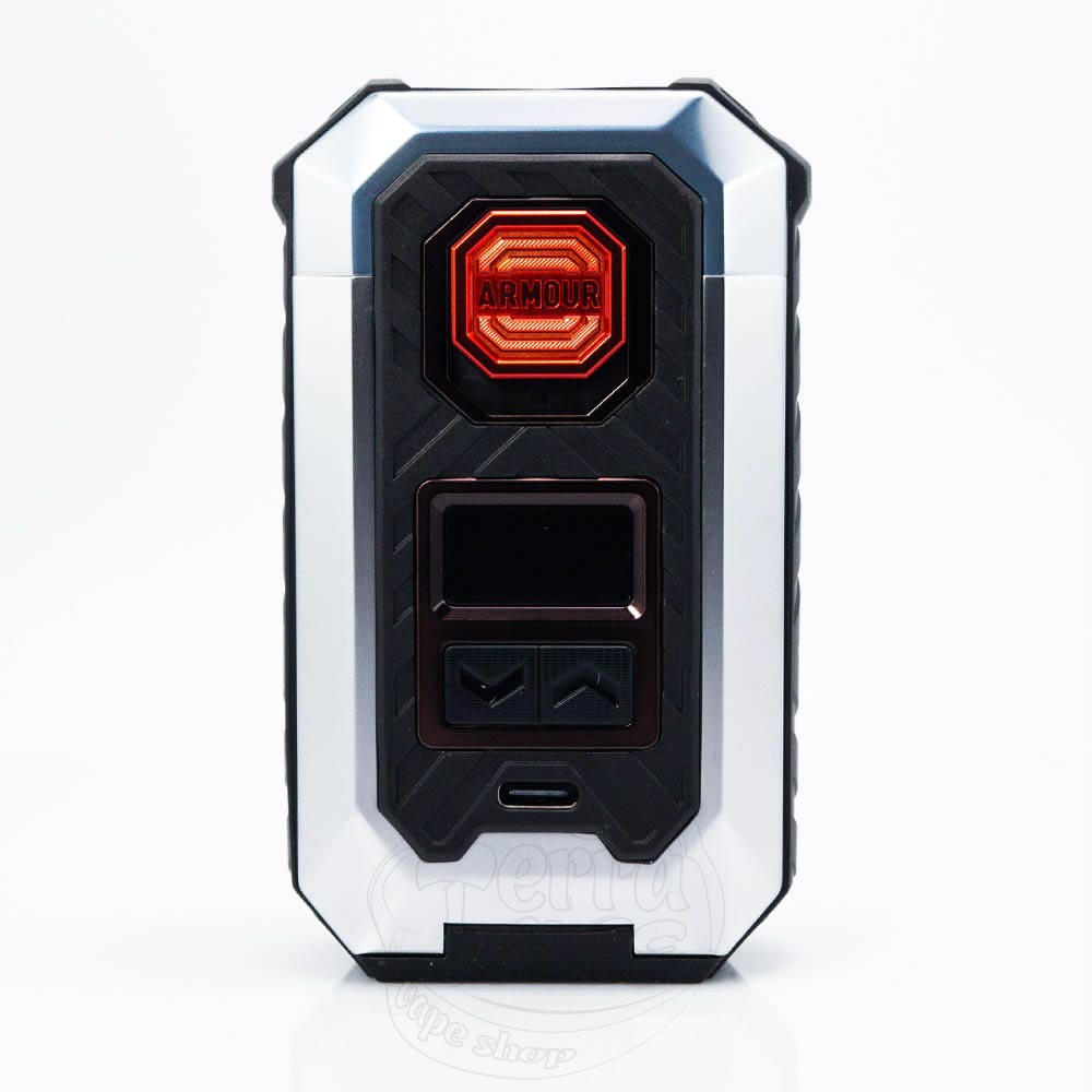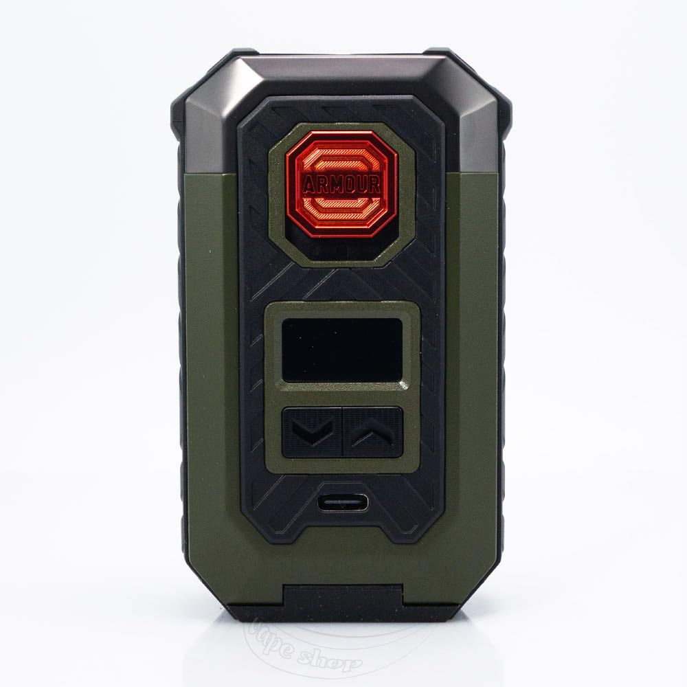 На лицевой части расположена большая кнопка активации с гравировкой "Armour". Вокруг нее имеется защитная рамка, а саму кнопку можно не только нажимать, но и передвигать вверх и вниз для блокировки. Ниже размещена панель, которая включает в себя 0.96-дюймовый дисплей и две кнопки управления "вверх" и "вниз". Экран не очень большой, но его размеры вполне соответствуют назначению вейпа, ведь таким образом шансы повредить дисплей при падении значительно уменьшаются. Под кнопками навигации находится зарядный разъем Type-C.