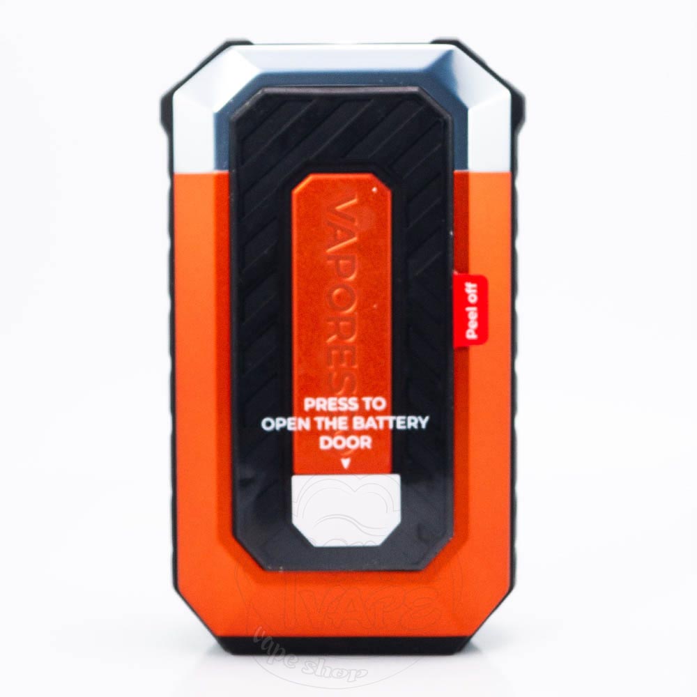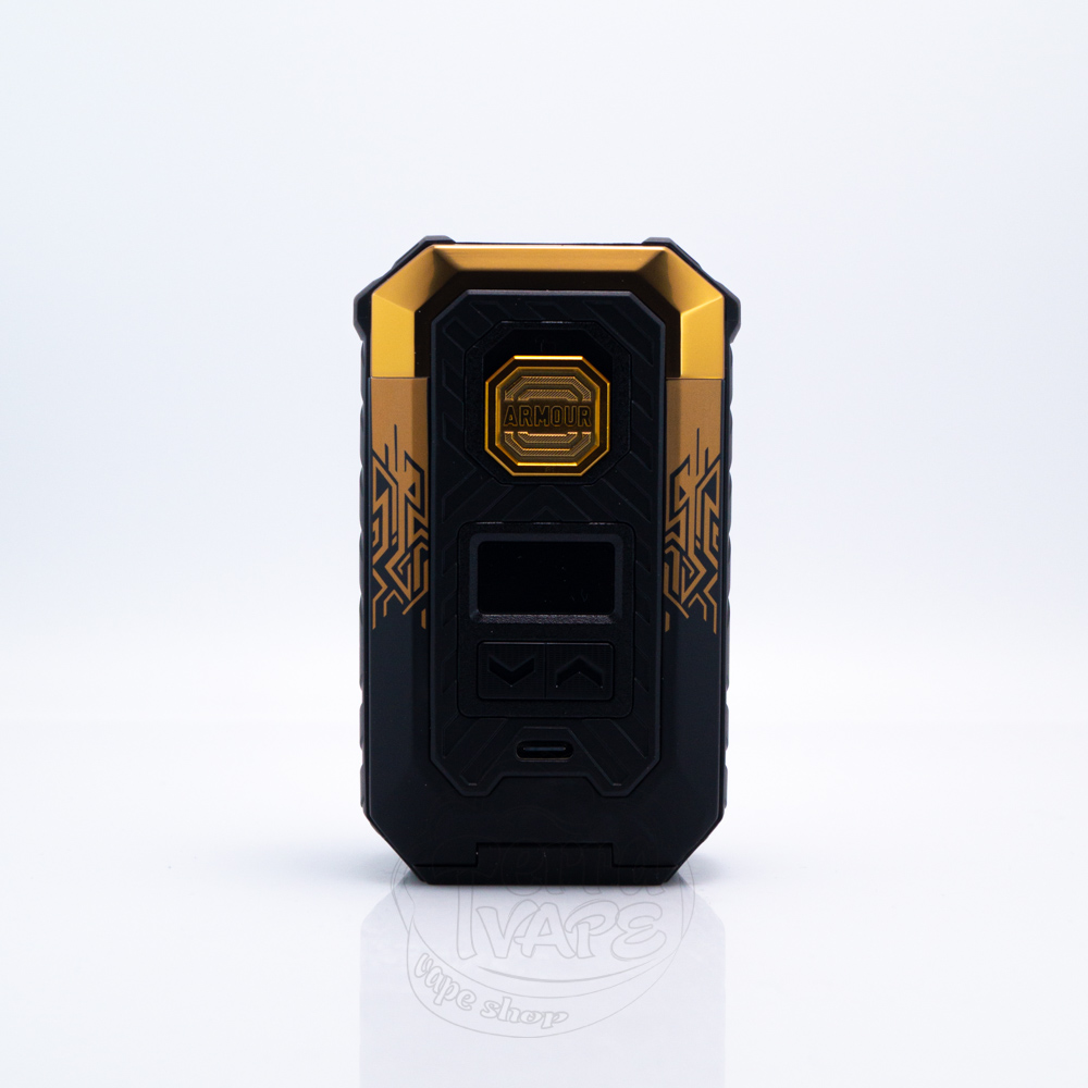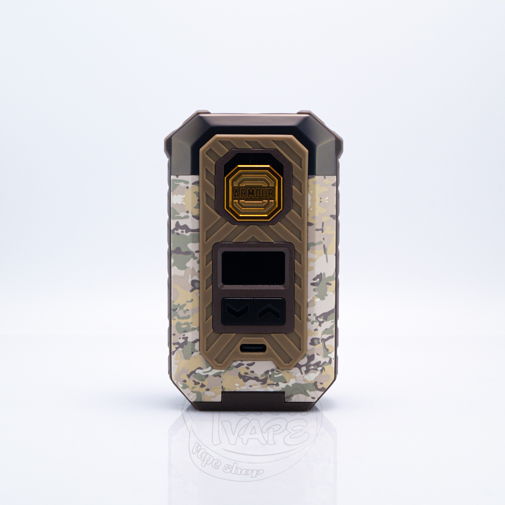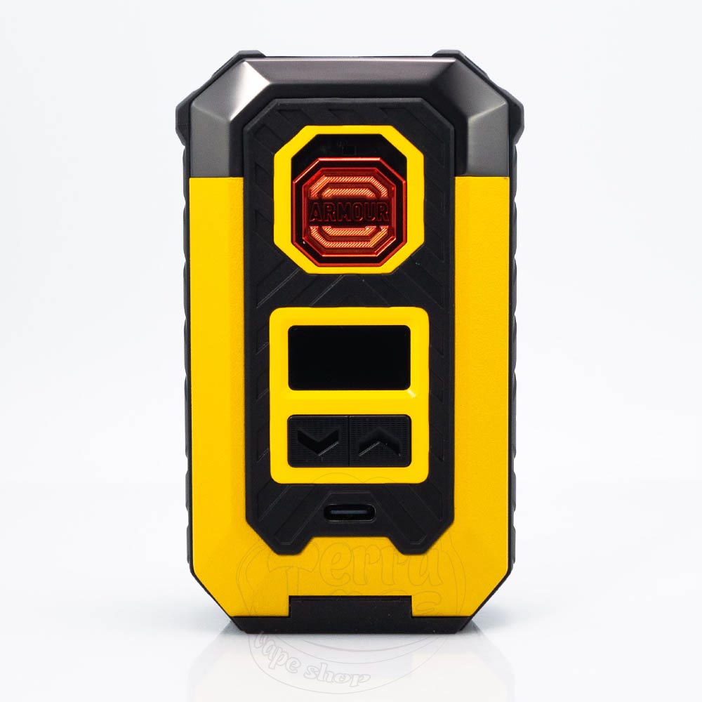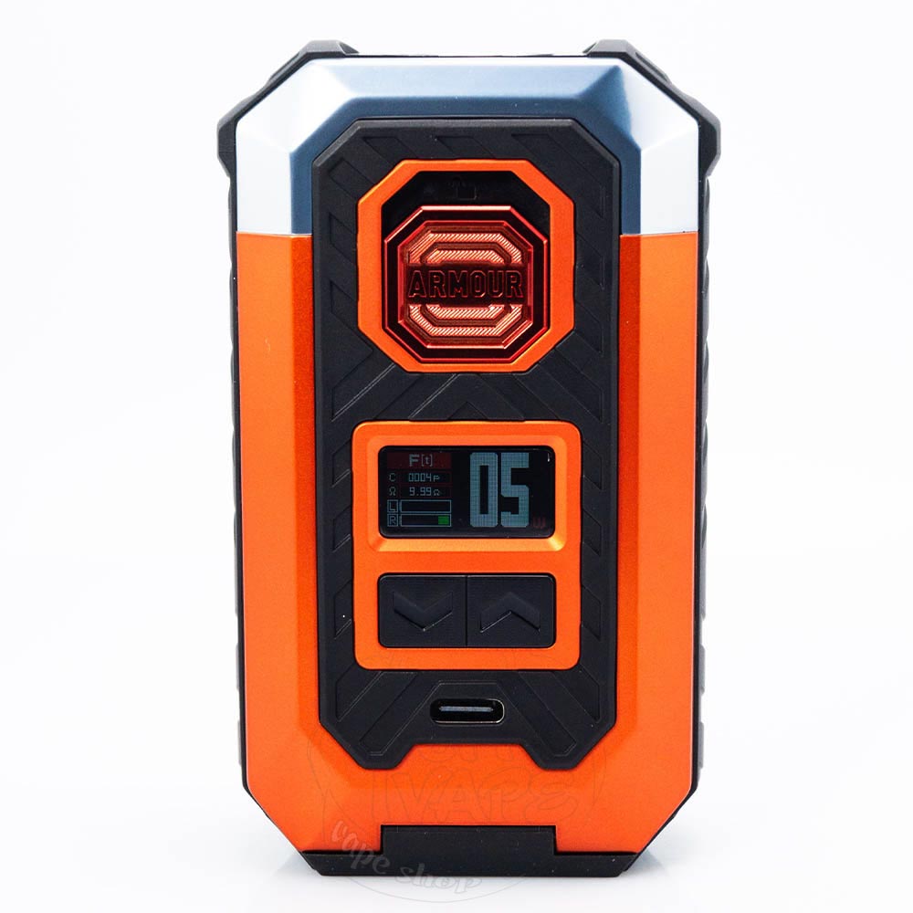 На лицевой части расположена большая кнопка активации с гравировкой "Armour". Вокруг нее имеется защитная рамка, а саму кнопку можно не только нажимать, но и передвигать вверх и вниз для блокировки. Ниже размещена панель, которая включает в себя 0.96-дюймовый дисплей и две кнопки управления "вверх" и "вниз". Экран не очень большой, но его размеры вполне соответствуют назначению вейпа, ведь таким образом шансы повредить дисплей при падении значительно уменьшаются. Под кнопками навигации находится зарядный разъем Type-C.