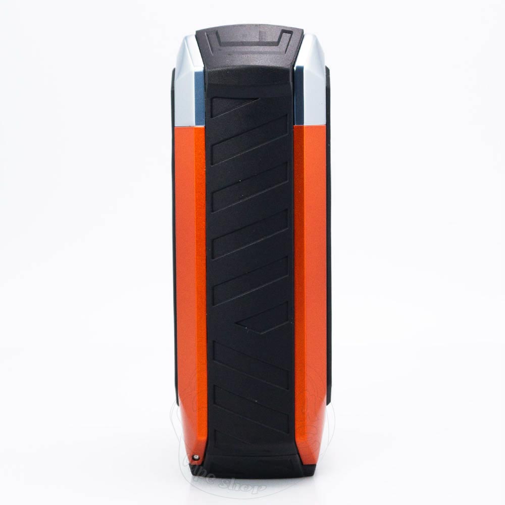 Бокс-мод имеет очень массивный и прочный корпус, а его дизайн выполнен таким образом, чтобы максимально предотвратить повреждения устройства. Все углы скошены, а два верхних имеют выступающие накладки, что также обеспечивает дополнительную защиту. Посадочная площадка Армор Макс довольно большая и способна размещать атомайзеры диаметром до 28мм без свисания. Несмотря на то, что девайс довольно большой, его удобно держать в руке за счет рельефных полос, которыми покрыта большая часть корпуса.