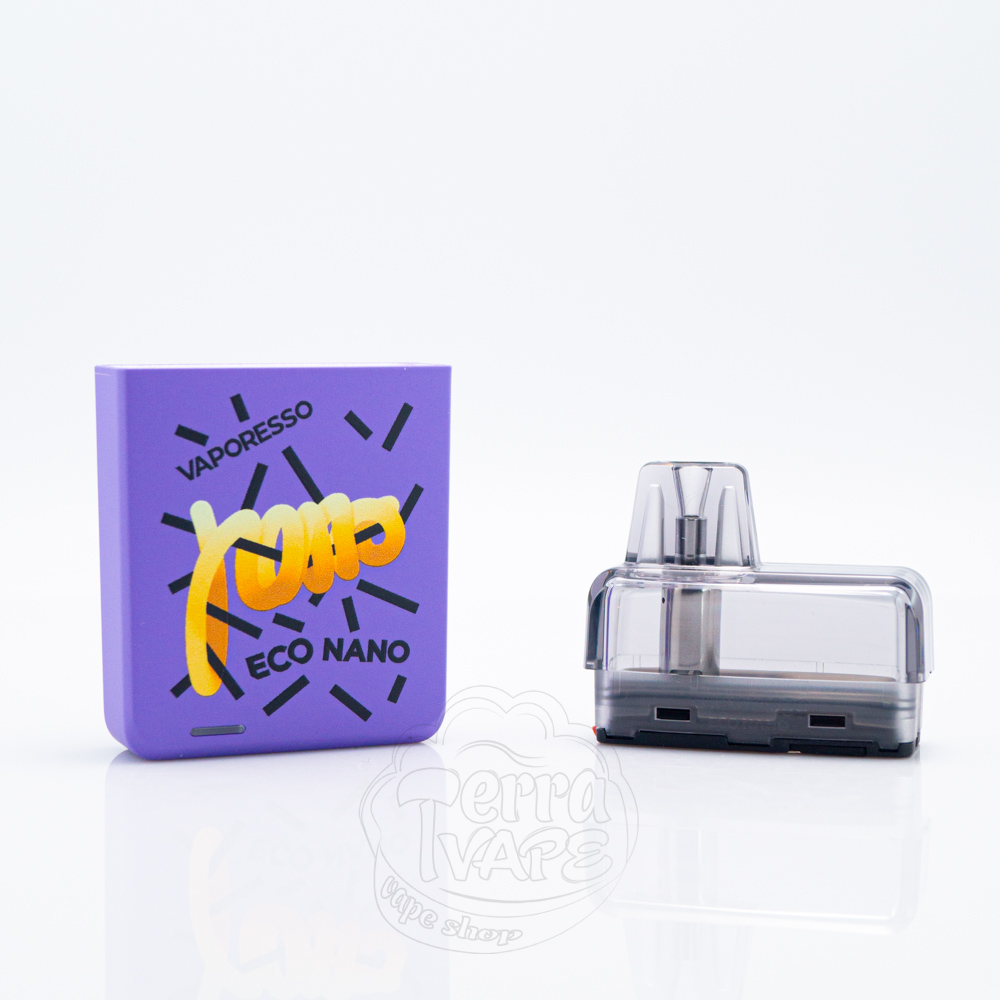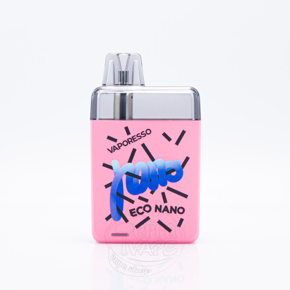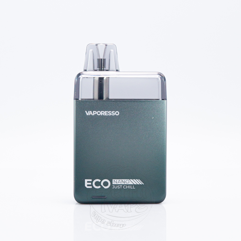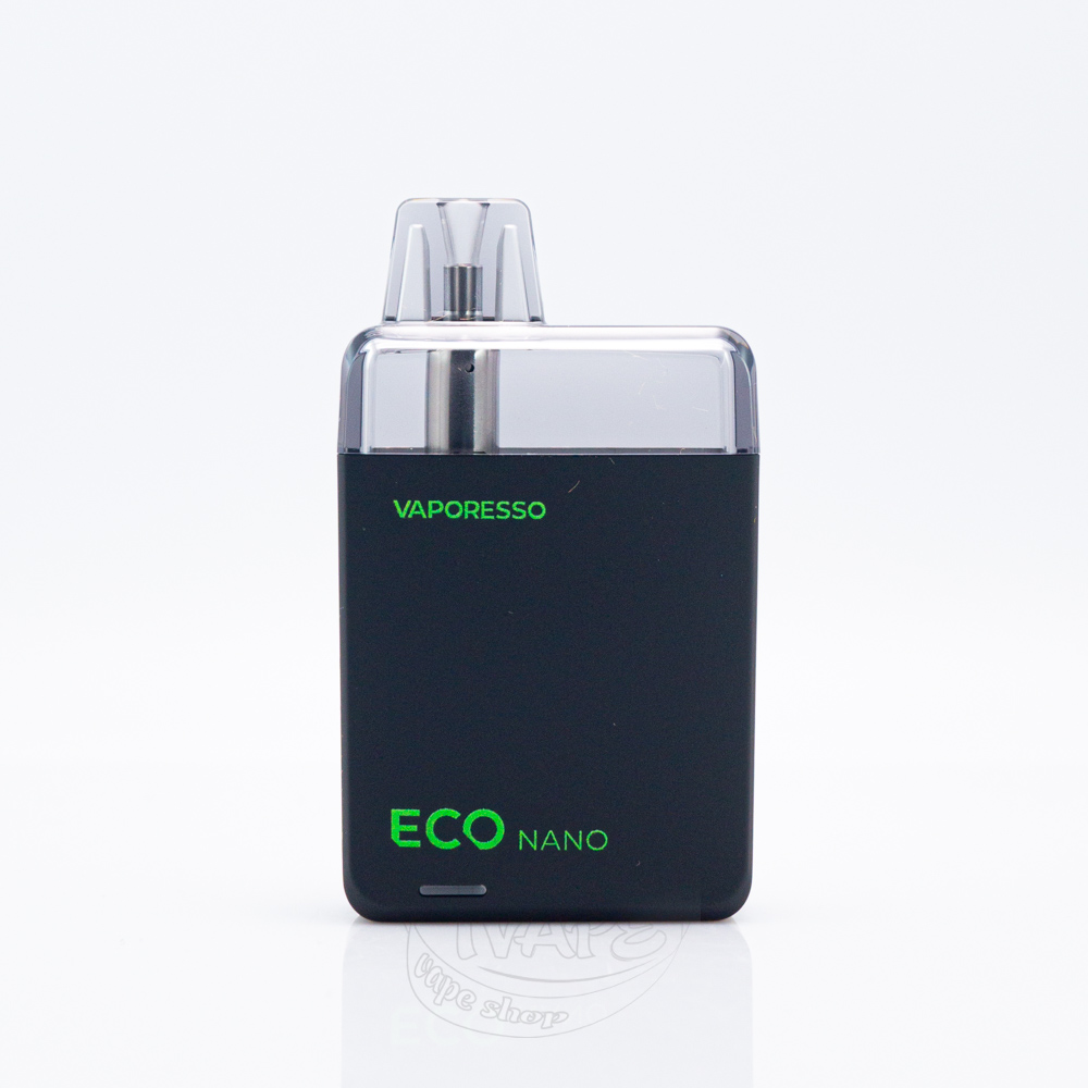 На передній панелі пристрою є логотип "Vaporesso", а також назва моделі "Eco Nano". В залежності від обраного колірного варіанту, стилізація цих написів відрізнятиметься. Прямо під брендингом розташувався непомітний продовгуватий індикатор, а у нижній частині знаходиться порт для зарядки Type-C.