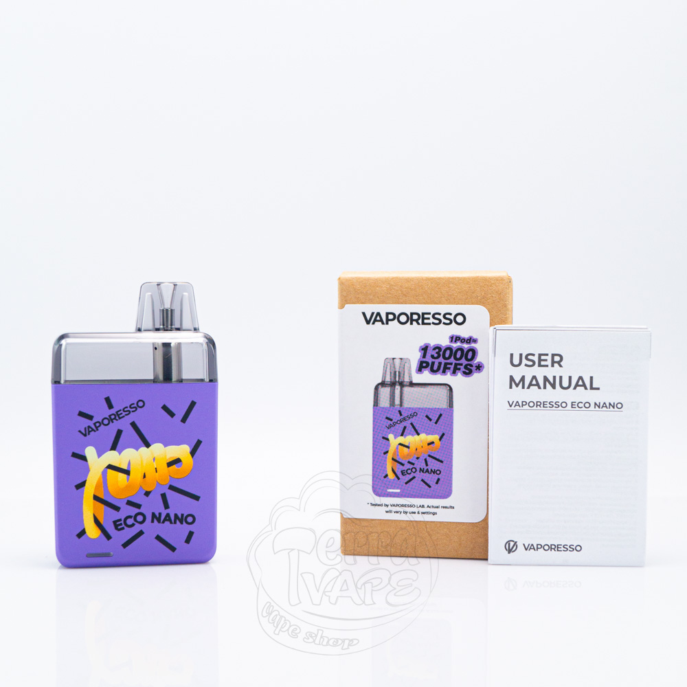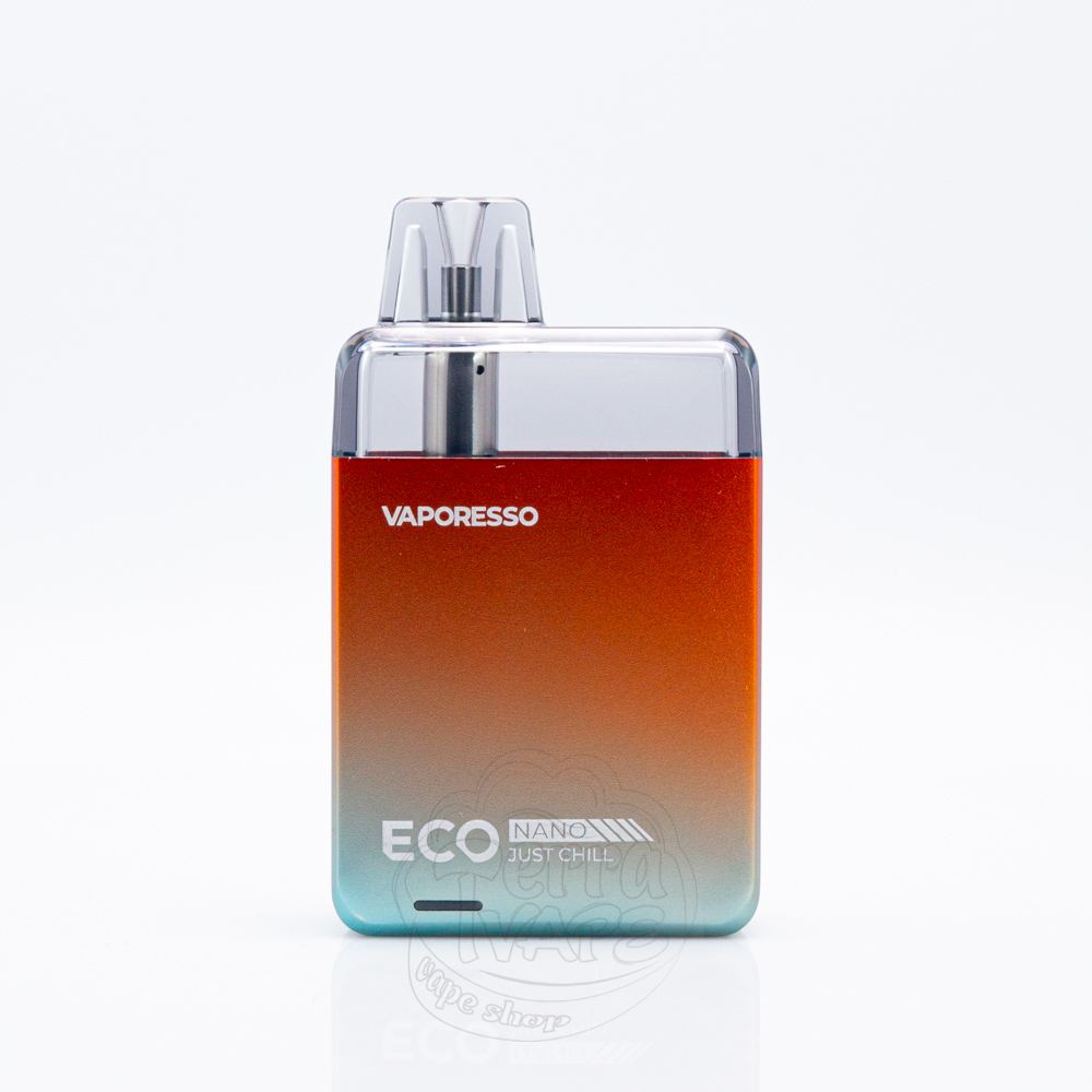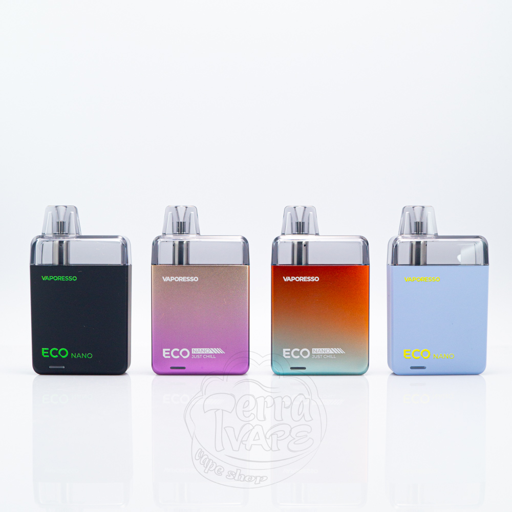 Vaporesso Eco Nano Pod Kit 1000mAh - це багаторазова електронна сигарета від компанії Vaporesso, автономність якої забезпечує вбудований акумулятор на 1000мАг. Працює з картриджем вражаючої ємності 6мл з нижньою заправкою. Пристрій розрахований на MTL вейпінг та чудово підходитиме новачкам. Активується від затяжки без зайвих налаштувань. Все дуже просто: заправляєте картридж, робите затяжку та одразу починаєте вейпити. Заряджається Еко Нано кабелем Type-C зі швидкістю струму 5V/1A.
