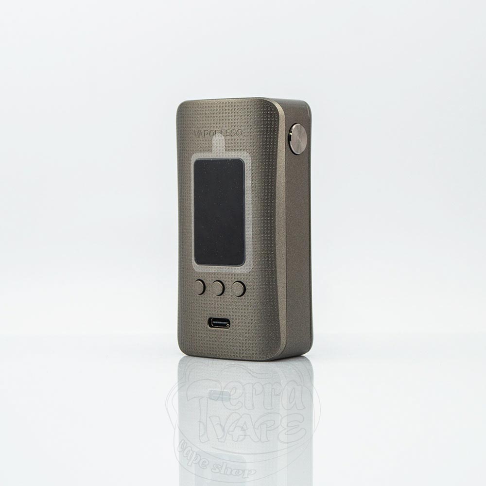 Верхня панель має центрований 510 конектор, з посадковим майданчиком до 28 мм. Передня панель елегантна та мінімалістична – великий кольоровий екран, під яким горизонтально розташувалися 3 кнопки регулювання, а також порт USB-C 5V/2A. Кнопка Fire розташована на боці, щоб забезпечити кращу ергономіку і більш природний жест.