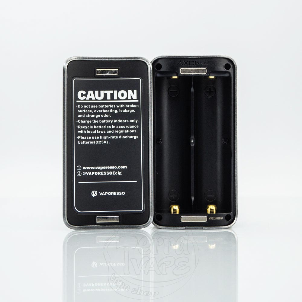 Доступ до відсіку батареї здійснюється шляхом зняття задньої панелі. Для цього підчепіть виїмку, розташовану під основою боксу. Кришка щільно тримається за допомогою двох потужних магнітів. Полярність вказана всередині бокс мода, дотримуйтесь її під час встановлення акумуляторів.