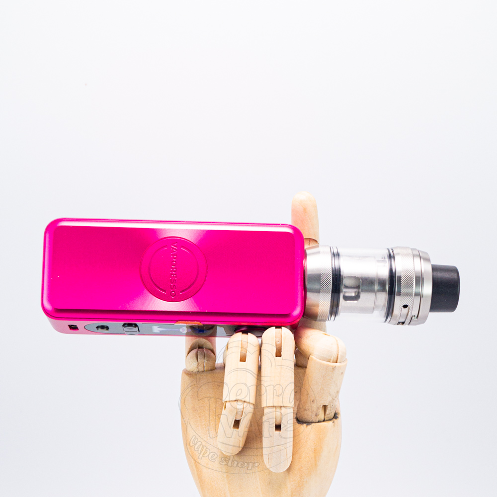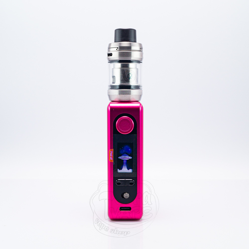 На передней стороне есть продолговатая овальная панель, на который находятся все элементы, которые вам будут необходимы для управления электронной сигаретой. Если начать перечень сверху вниз, то первой вас встречает круглая кнопка запуска, за ней следует яркий 0.96-дюймовый TFT дисплей, ниже две кнопки для навигации, ползунок блокировки и зарядный разъем Туре-С.
