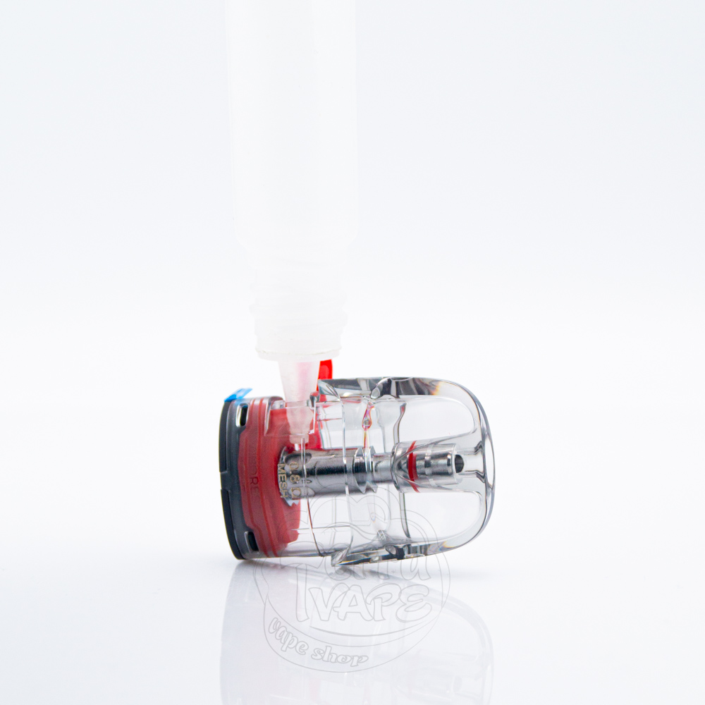 Спосіб заправки залежить від того, який саме картридж ви використовуєте. З коробки ви отримуєте один картридж на 0.8Ом об'ємом 3мл. Саме він буде заправлятися через бічний отвір, прикритий гумовою заглушкою. Якщо говорити простіше, то ви можете встановлювати картриджі з ємністю 2мл або 3мл. Ті з них, які вміщатимуть 3мл, будуть заправлятися збоку, а ті, які вміщують 2мл рідини - зверху.