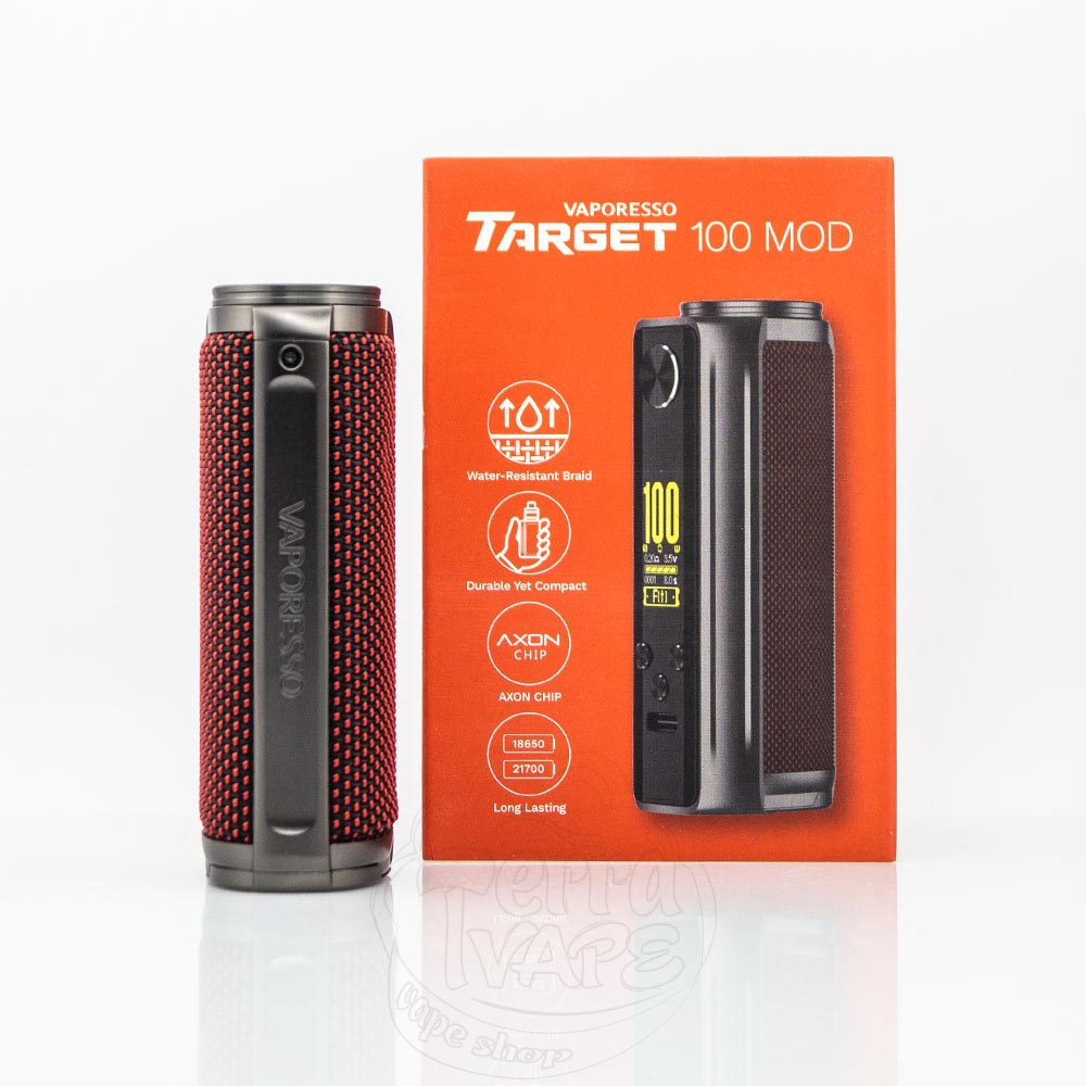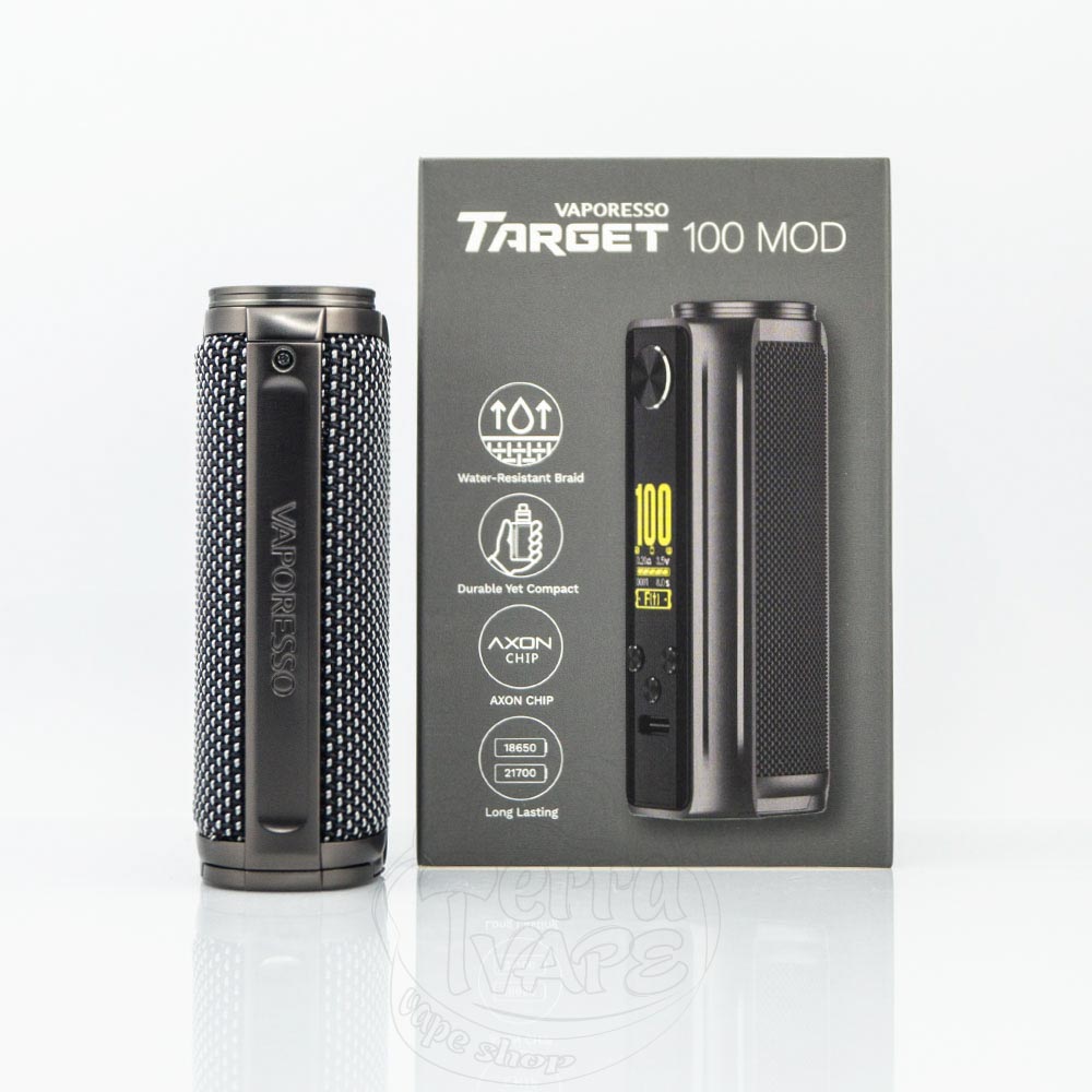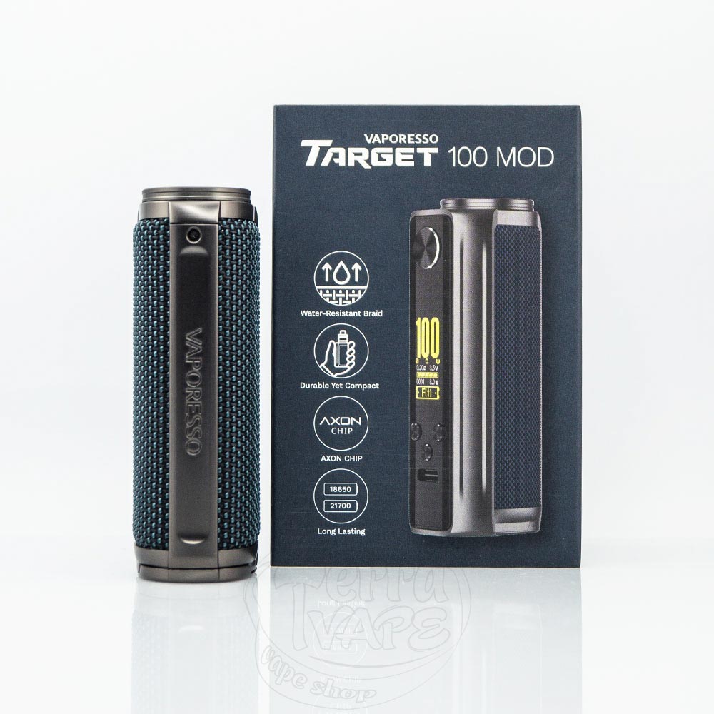 Vaporesso Target 100 Mod 100W – це одноакумуляторний бокс мод від компанії Vaporesso. Підтримує акумулятори формату 21700 та 18650. Діапазон вихідної потужності становить 5-100W. Діаметр посадкового майданчика – 25мм. Фірмовий чіпсет Axon 2.0 забезпечує безвідмовну роботу, безпеку використання та підтримує безліч режимів. Відмінний аксесуар для зв'язки з односпіральним атомайзером.