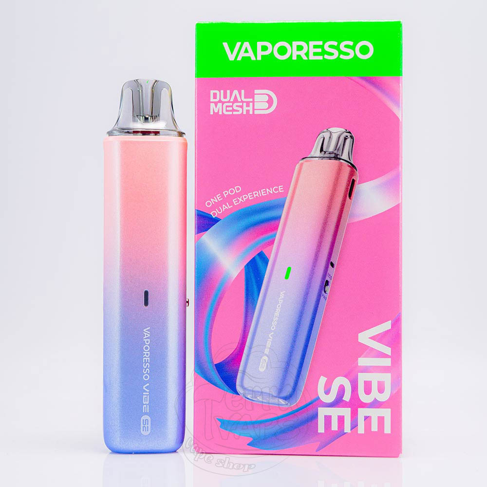 Vaporesso Vibe SE Pod System Kit 1100mAh Ice Cream Pink - це багаторазова под-система світло-рожевого з блакитним кольору, нове доповнення яскравої лінійки Vibe від компанії Vaporesso. Місткість акумулятору пристрою складає 1100мАг, а об'єм картриджа - 4.5мл. Под-система надає можливість легко змінювати режими роботи та тугість затяжки за допомогою мультифункціонального слайдера на бічній панелі. На передній панелі розташовано кольоровий індикатор заряду.