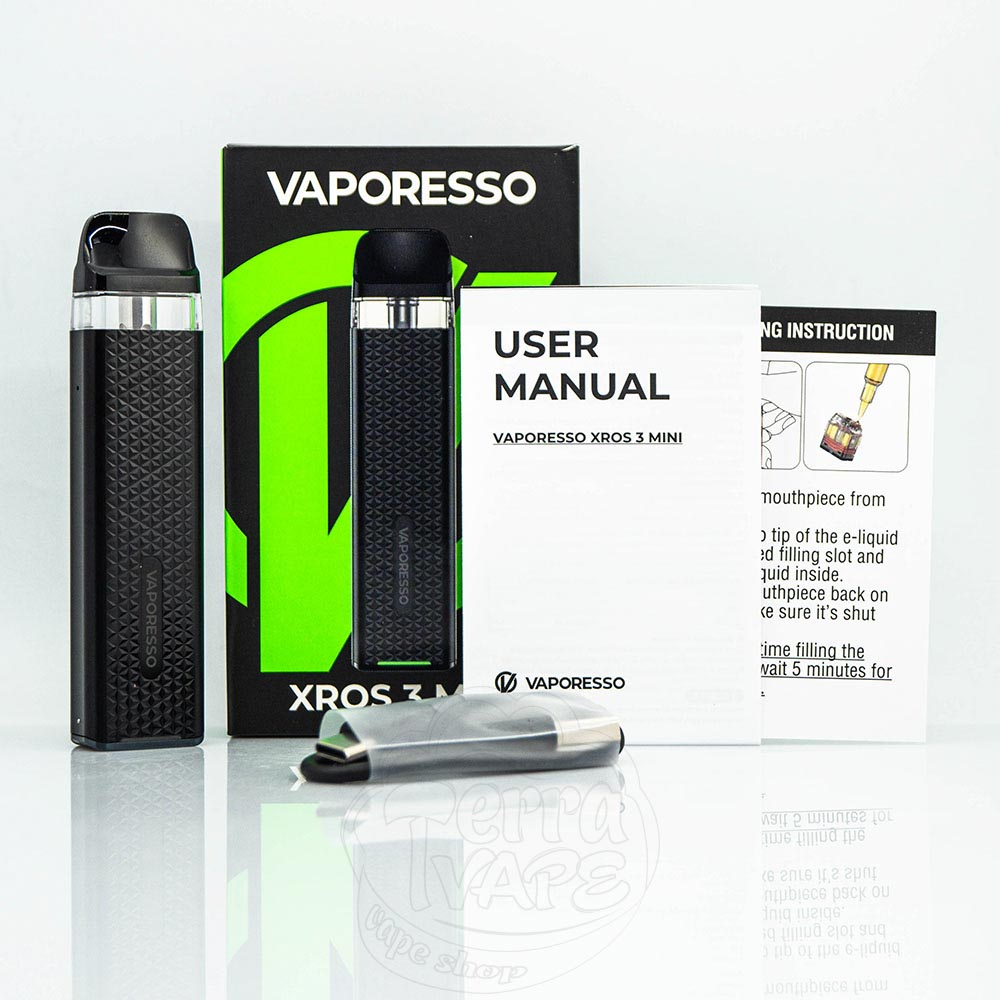 Vaporesso XROS 3 Mini Pod System Kit - це міні-версія вже третьої версії популярної багаторазової pod-системи від вейп-компанії Vaporesso - XROS 3. Має вбудовану батарею на значні 1000мАг. Працює зі змінними картриджами об'ємом 2 мл, які також сумісні з усіма попередніми моделями цієї лінійки. Система заправки - верхня. Заряджається через роз'єм Type-C.
