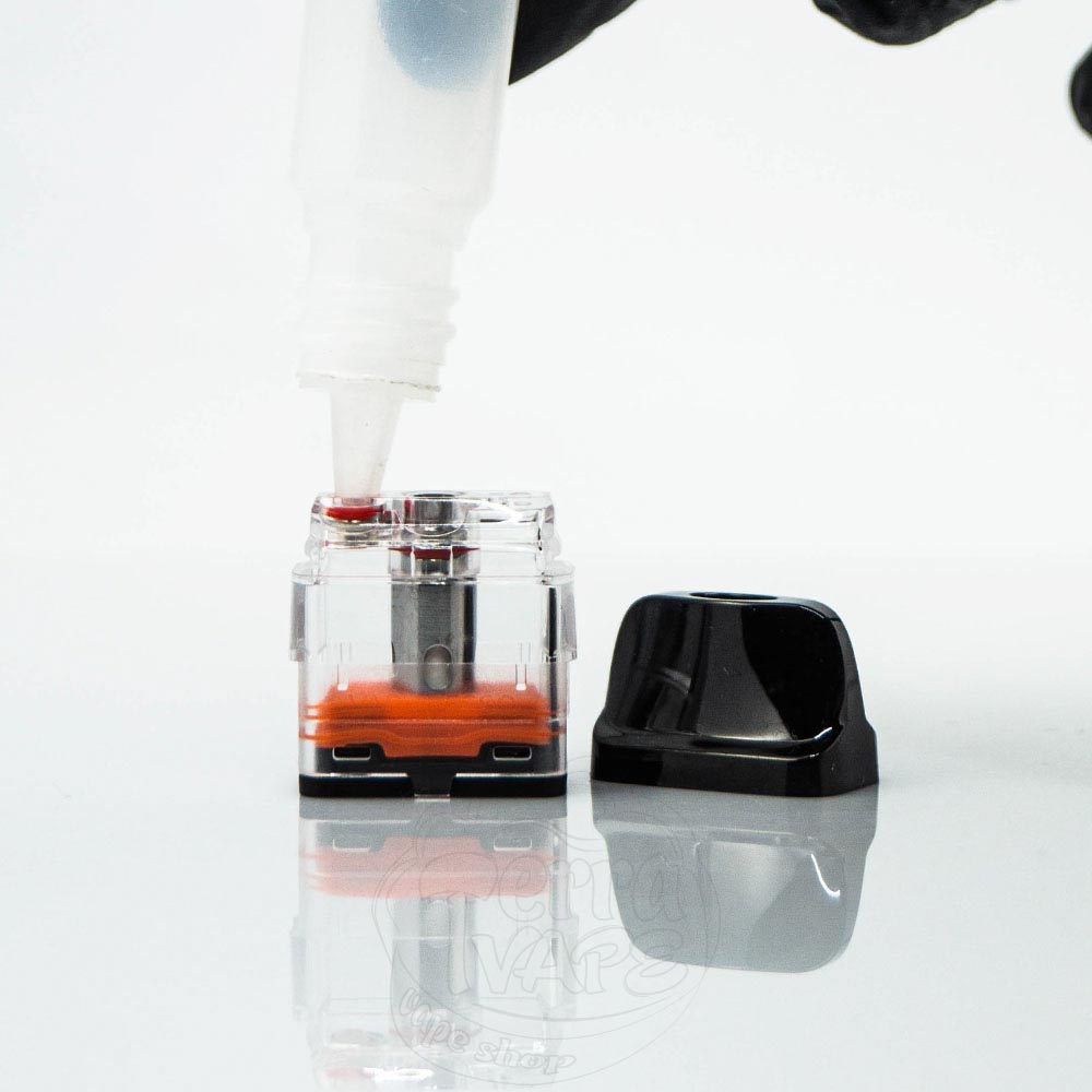 - Вставте носик флакона з рідиною для вейпа в червоний отвір і залийте рідину.