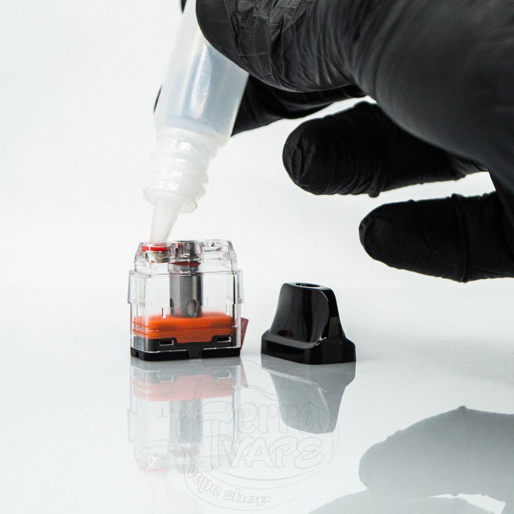 - У червоний отвір вставте носик обраної баночки з рідиною. У картридж з опором 1.0Ом рекомендується заливати рідину на сольовому нікотині, а в 0.6Ом можна також лити органіку. Заправте картридж на 2/3 і поверніть мундштук на місце.