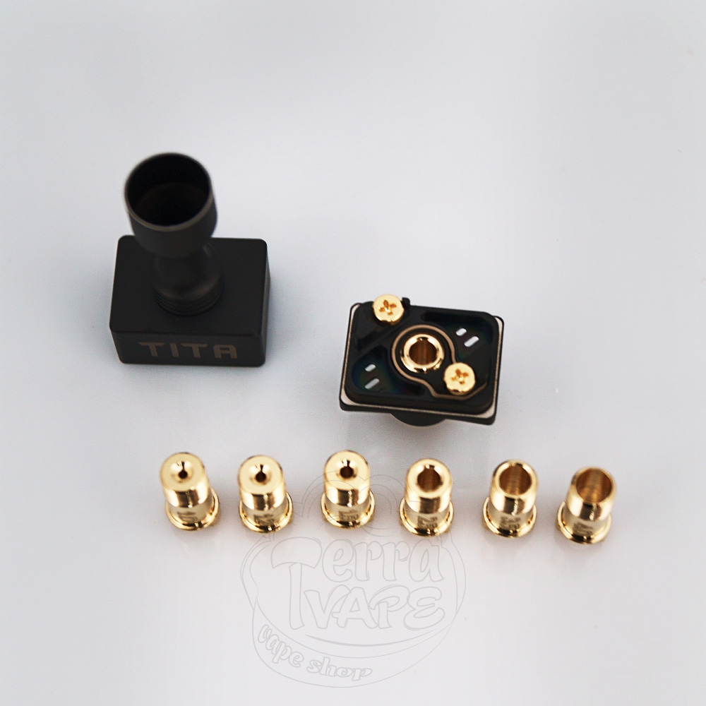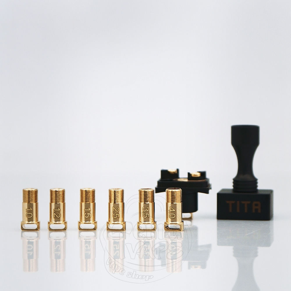 Обдув спіралі регулюється пінами з різним діаметром внутрішнього отвору. TITA X RBA комплектується 7 різними пінами обдування, завдяки чому цей бридж можна використовувати як під тугу сигаретну затяжку (MTL), так і під більш вільну (RDL/DL).