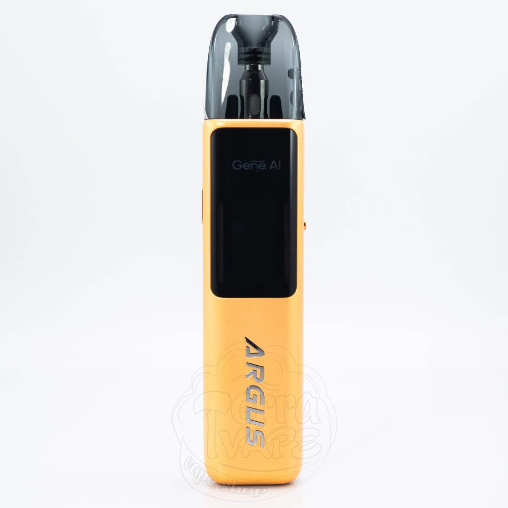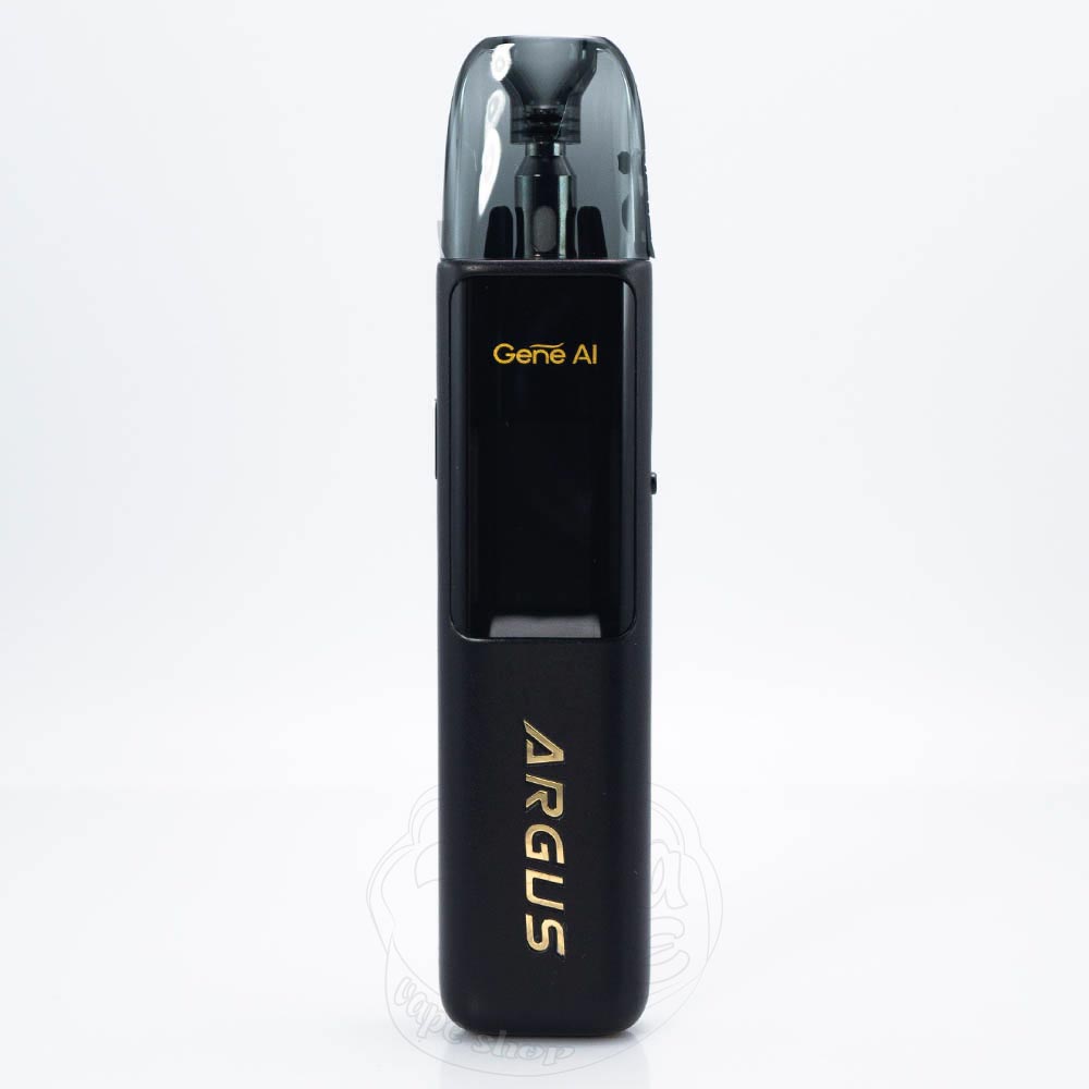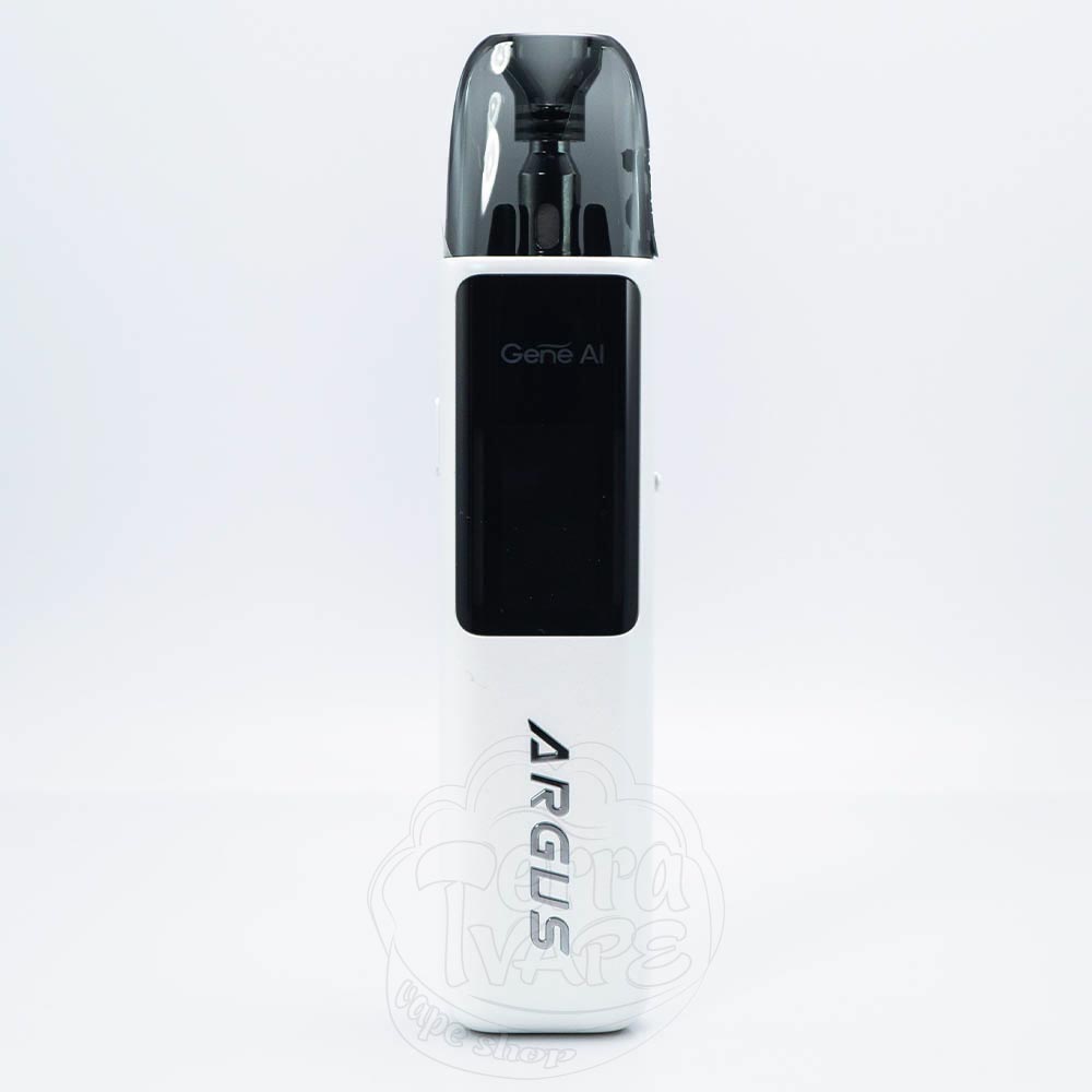 Спереду під екраном розташувався великий логотип "Argus", а вгорі - позначення вбудованого чіпу Gene AI. На бічній частині корпусу знаходяться регулятор затяжки з однієї сторони, а також кнопка та зарядний порт з протилежної. Задня панель має приємну текстуру з візерунками, а на дно основи додана силіконова підкладка, завдяки якій девайс стає більш стійким.