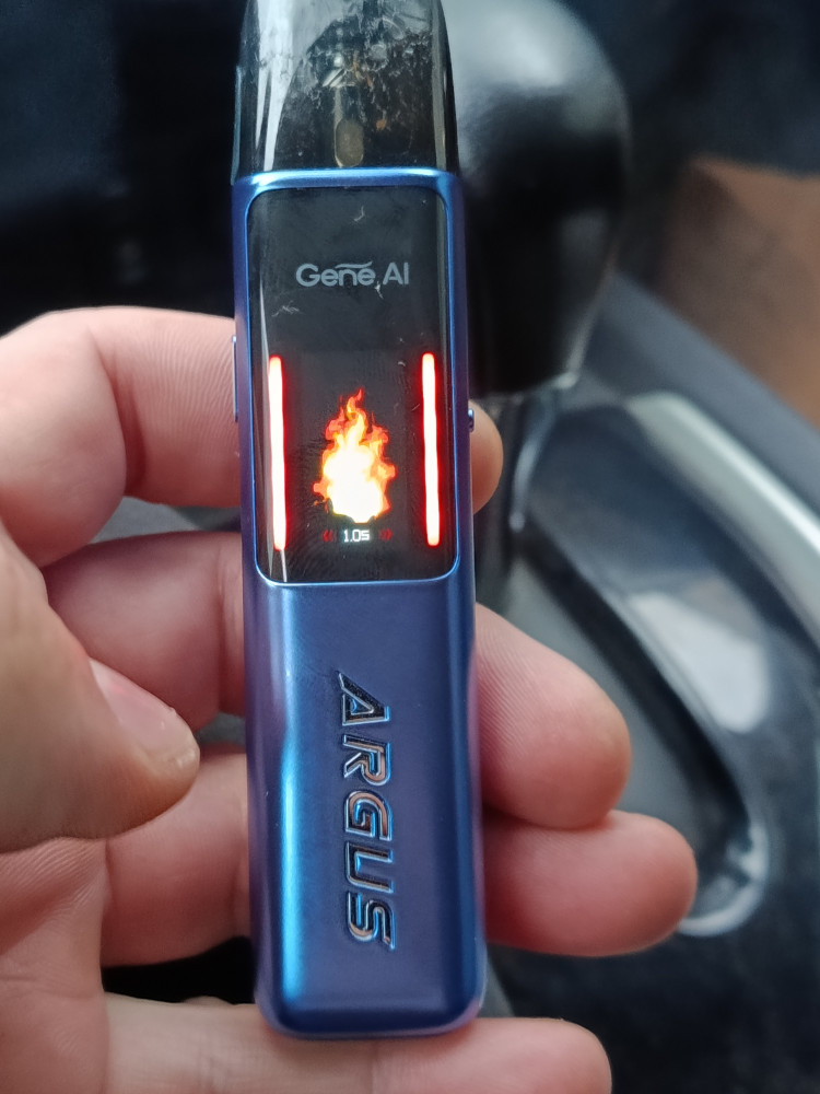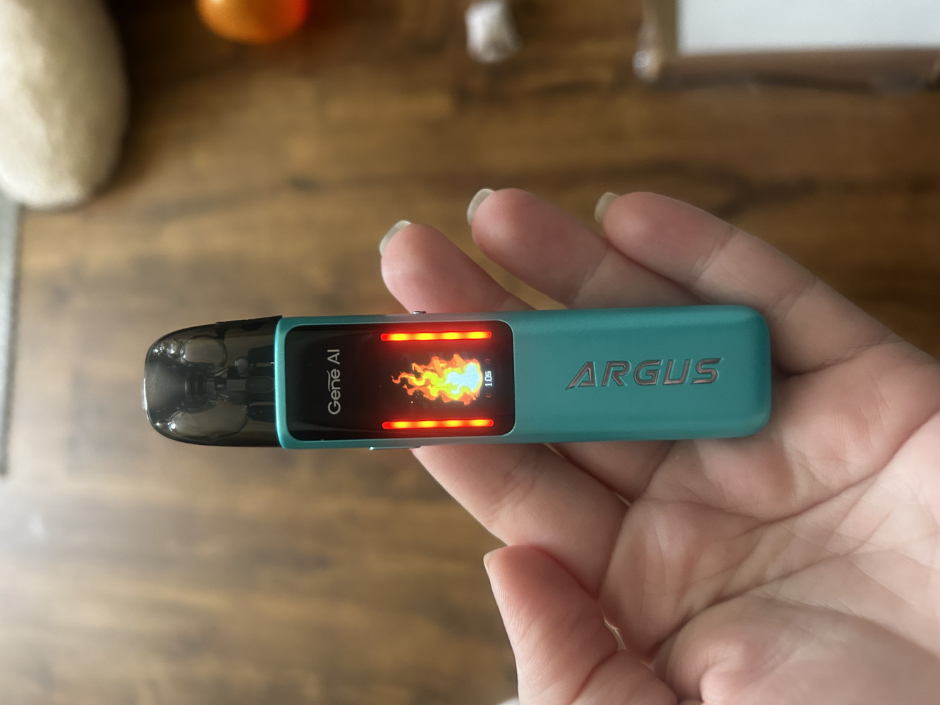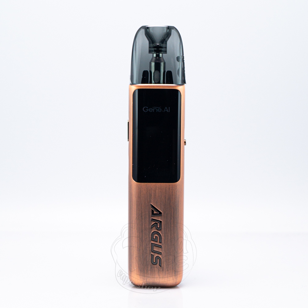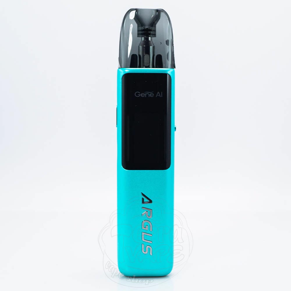 Спереду під екраном розташувався великий логотип "Argus", а вгорі - позначення вбудованого чіпу Gene AI. На бічній частині корпусу знаходяться регулятор затяжки з однієї сторони, а також кнопка та зарядний порт з протилежної. Задня панель має приємну текстуру з візерунками, а на дно основи додана силіконова підкладка, завдяки якій девайс стає більш стійким.