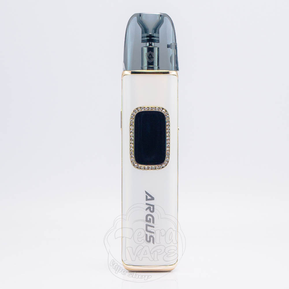 VooPoo Argus G3 Pod Kit 1500mAh Diamond White - це нова багаторазова под-система біло-золотистого кольору зі стразами, поповнення популярної лінійки Argus від компанії VooPoo. Ця модель може похвалитись оновленим дизайном та значно збільшеною місткістю акумулятора, яка тепер складає цілих 1500мАг (на 500мАг більше, ніж у попередній моделі). Максимальна вихідна потужність складає 30W, що буде чудовим варіантом для любителів MTL та RDL-паріння.