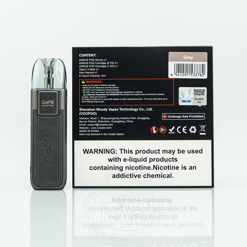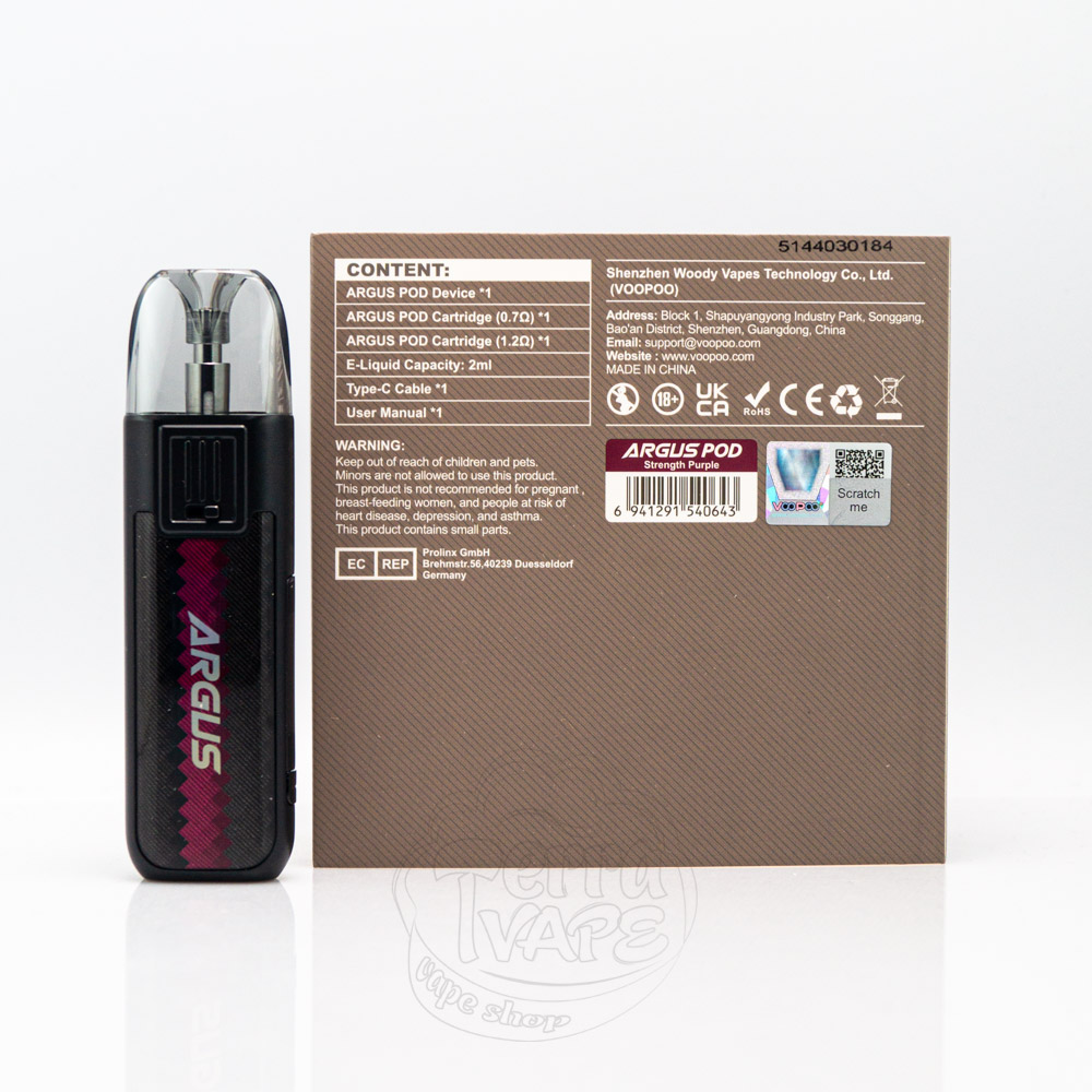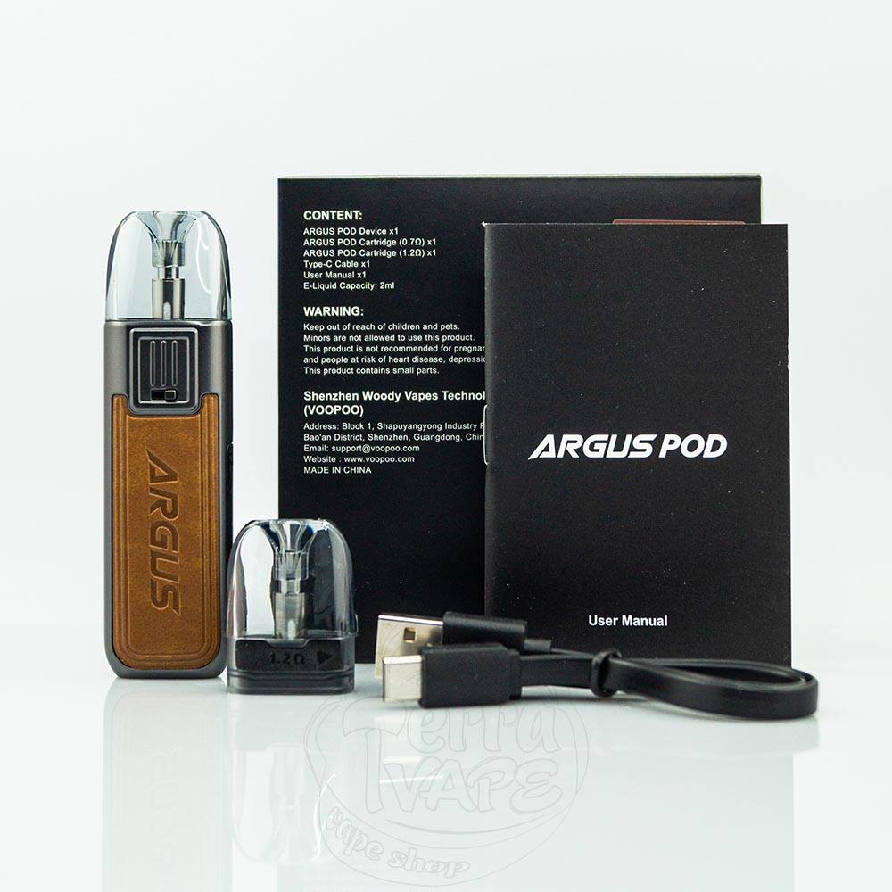 VooPoo Argus Pod Kit 20W 800mAh – це багаторазова под система із серії Argus від компанії VooPoo. Працює від вбудованого акумулятора ємністю 800мАч зі змінними картриджами об'ємом 2мл. Активується від затяжки. Має компактний розмір і стильний зовнішній вигляд, тому відмінно підійде як пристрій щодня, в тому числі і для новачків.