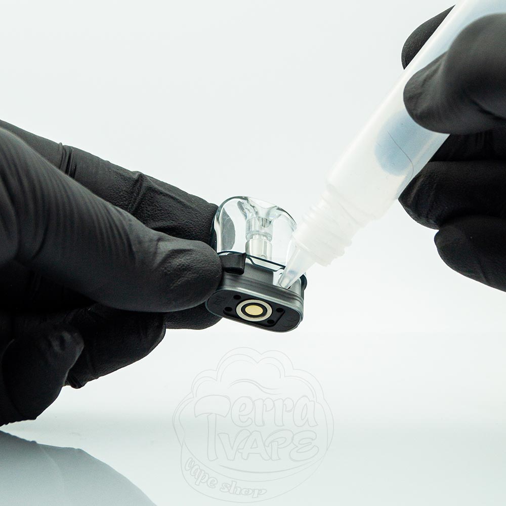 Щоб заправити рідину для електронних сигарет, необхідно відкрити бічну заглушку. Після першої заправки нового картриджа не забудьте почекати близько 10 хвилин, поки вата навколо нагрівального елемента добре просочиться, щоб уникнути сухих затяжок.