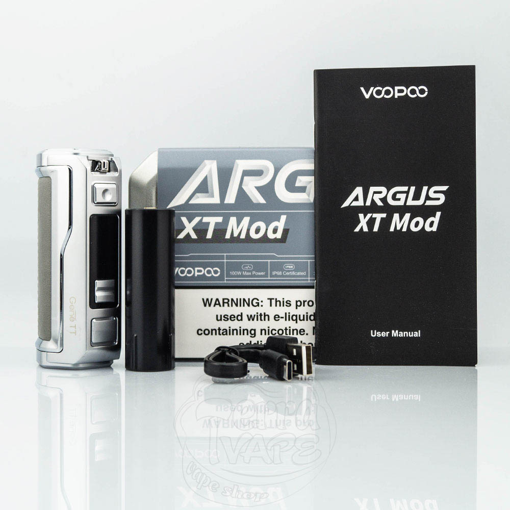 Voopoo Argus XT 100W Box Mod - це бокс-мод серії Argus від популярного вейп-виробника Voopoo. Працює від одного акумулятора 18650 або 21700 (не входять до комплекту постачання) з максимальною вихідною потужністю 100W. Має 4 режими роботи. Підтримує всі сучасні системи захисту. Сертифікований за стандартом IP68, що означає пило-, вологозахищений і ударостійкий. Посадковий майданчик може вмістити атомайзери з 510 конектором діаметром до 26мм. Має механічну кнопку блокування, завдяки якій користувач може зручніше і швидше блокувати роботу девайса, щоб уникнути автофайерів.