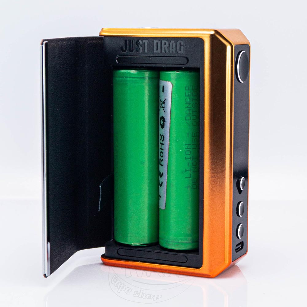 Для того, щоб Драг 5 почав працювати, вам необхідно встановити дві батареї формату 18650. Будьте уважні! Елементи живлення не входять до комплектації! Замовити акумулятори ви зможете у вейп-шопі TerraVape. На дверцятах ви помітите відмітку "Push", яка вказуватиме на зону, яку потрібно підштовхнути, щоб комірки для установки стали доступними. Всередині них буде позначена полярність, а також додана стрічка, за допомогою якої ви зможете швидко дістати акумулятори.