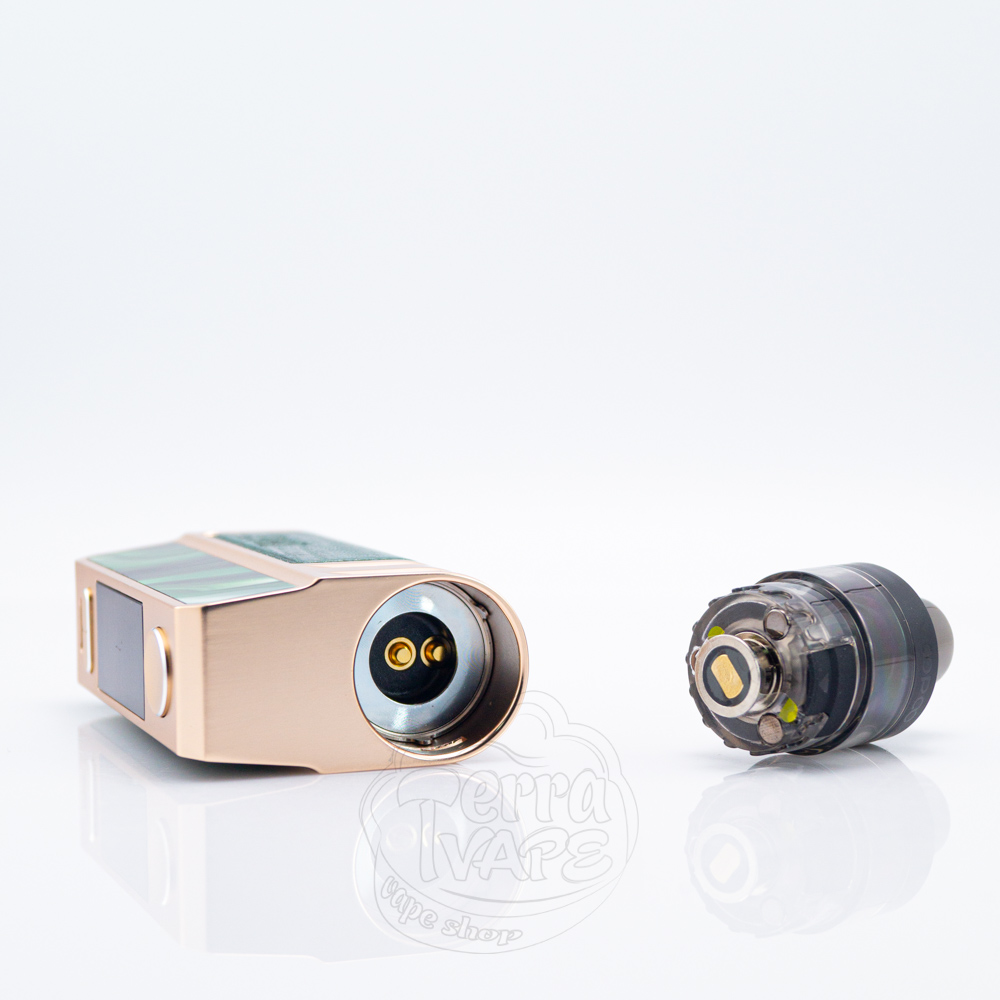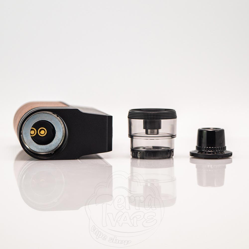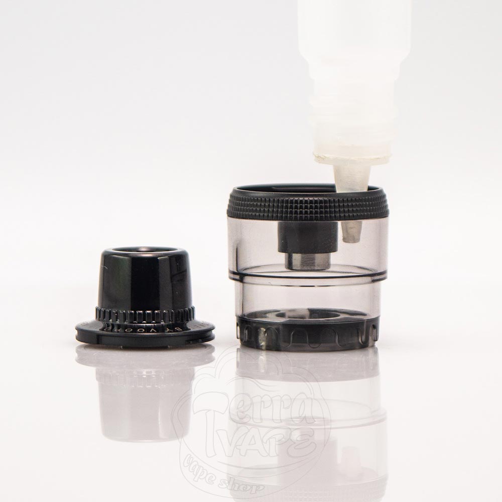 Обновленный вариант имеет объем 5мл и заправляется сбоку через отверстие, прикрытое резиновой заглушкой. Мундштук съемный, а из коробки вы получаете дополнительный дрип-тип небольшого диаметра для MTL вейпинга. Прозрачный, изготовлен из пластика и крепится к корпусу тремя сильными магнитами.