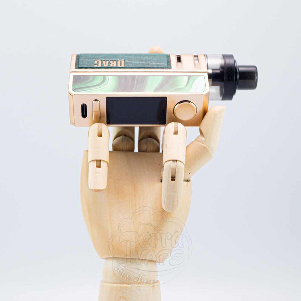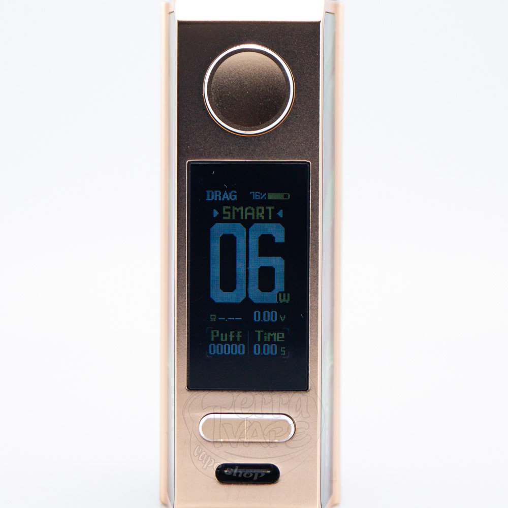 Drag E60 имеет форму прямоугольного бокса и изготовлен из цинкового и алюминиевого сплавов, а также кожи. Обе панели выглядят очень привлекательно и добротно. На закругленной части девайса находится кожаная вставка со строчкой, которая ее контурирует. Также на ней размещен логотип DRAG. В верхней части находится круглая, немного вогнутая кнопка активации. Она приятная на ощупь и достаточно чувствительная. Под ней расположен красочный экран, а еще ниже - две кнопки управления, которые выглядят как одна, разделенная полоской. В самом низу корпуса есть порт для зарядки.