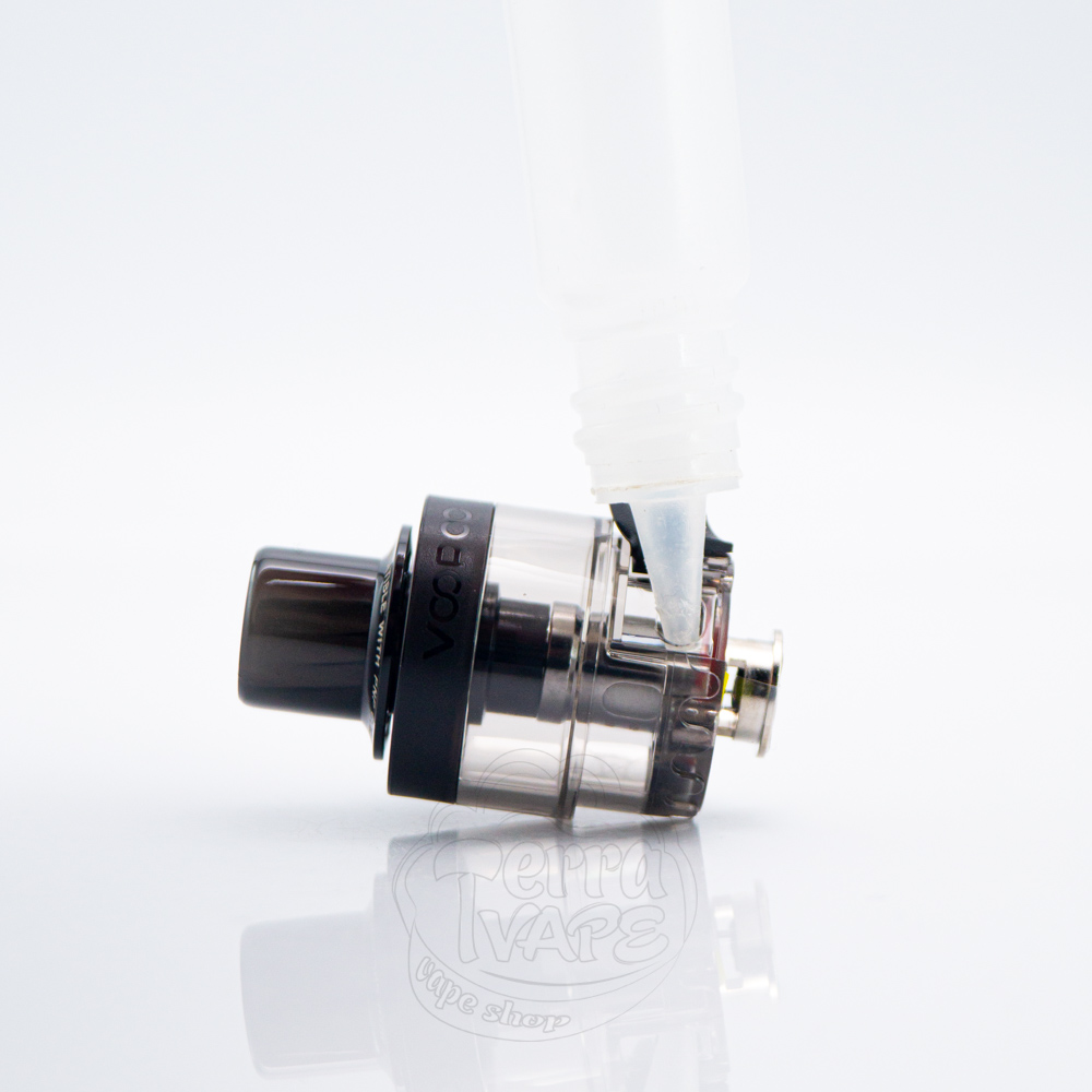 Заправити картридж ви зможете через отвір, що знаходиться на бічній стороні. Просто зніміть силіконову заглушку, залийте жижку та помістіть резервуар у батарейний блок електронної сигарети. Також однією з переваг нового картриджа є можливість заміняти мундштук, а з коробки ви отримуєте широкий дріп-тип, який ідеально підходить для використання з комплектними випарниками.