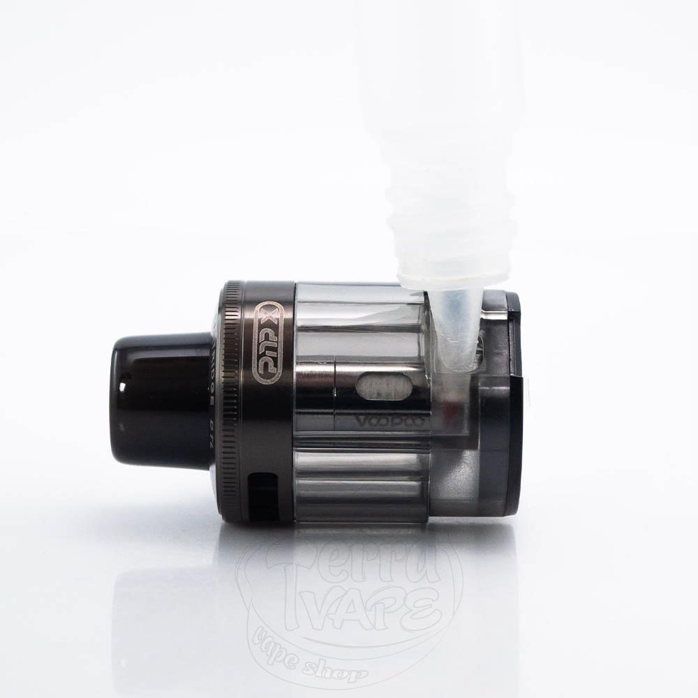 Резервуар може вмістити 5мл рідини для вейпів, тому вам не доведеться часто його заправляти та гаяти на це час. Реалізований бічний тип заправки, а сам отвір Вупу розмістили у нижній частині корпусу. Приємною особливістю є вбудоване кільце налаштування обдуву з обертом на 360 градусів. Встановлюйте кільце у будь-яке положення, щоб отримувати ще більше задоволення від смачної пари. Картридж працює зі змінними випарниками PnP-X та не сумісний з усіма іншими нагрівальними елементами.