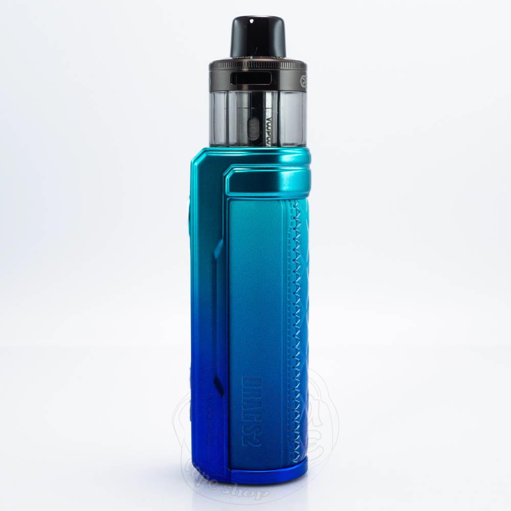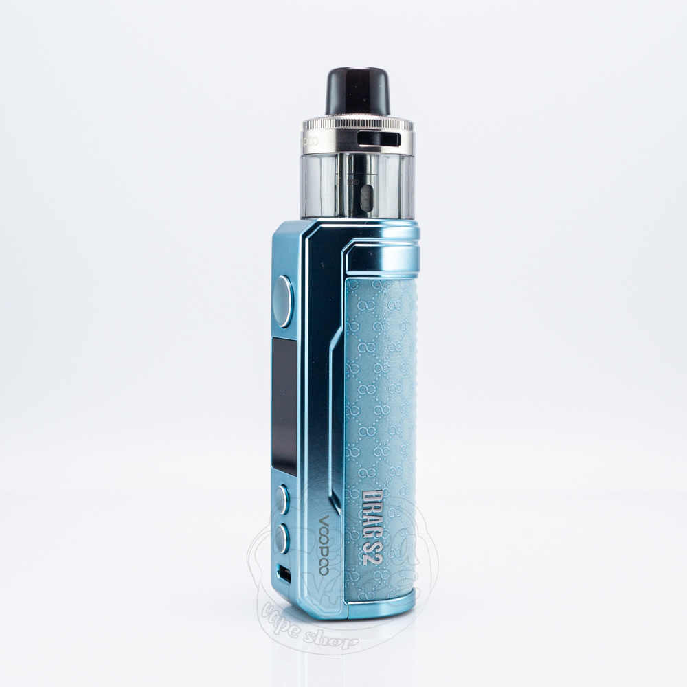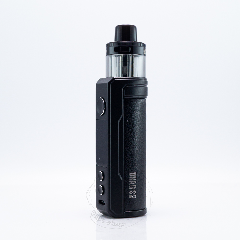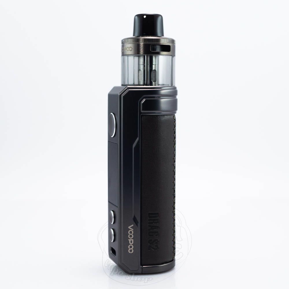 Девайс имеет эргономичную цилиндрическую форму с удобным расположением элементов управления. Размеры Drag S2 составляют 122мм в высоту (вместе с картриджем), 32.8мм в глубину и 28.6мм в ширину. Если сравнивать его габариты с Drag Х2, то они будут практически идентичными за исключением высоты, S2 будет немного ниже. Передняя панель, дно и верхушка выполнены из металла, а остальная часть вейпа покрыта материалом из экокожи, который приятно ощущается в руке.