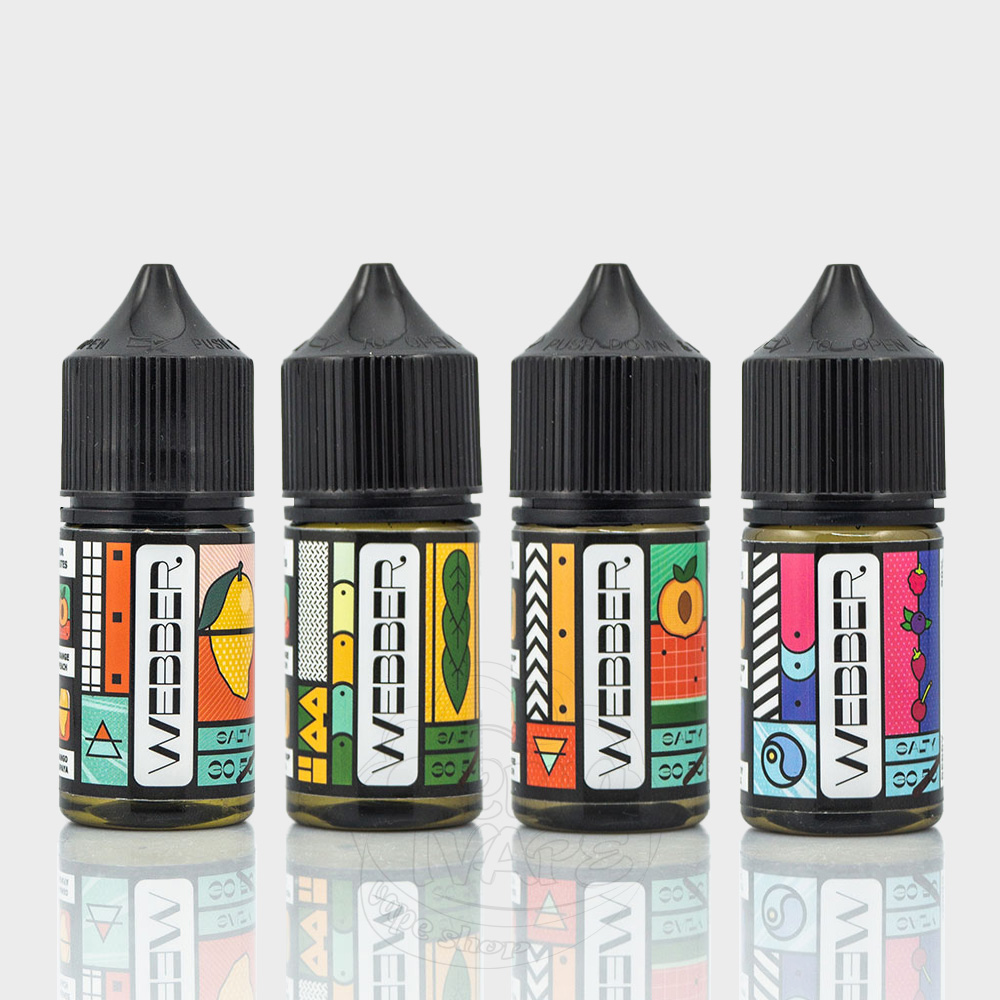 Webber Salt - це набір для самостійного приготування сольової рідини для вейпа від перевіреного роками українського виробника UA E-Juice. Випускається в пластикових флаконах об'ємом 30 мл з контролем першого відкриття. Яскрава етикетка має впізнаваний дизайн і натякає користувачеві про ключові інгредієнти обраного смаку абстрактними зображеннями, а написи в правому верхньому кутку чітко інформують про процентне співвідношення ароматизаторів.
