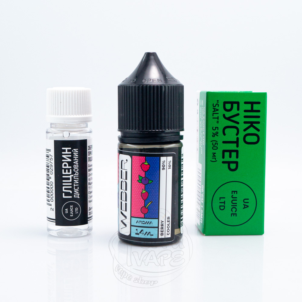 Webber Salt - це набір для самостійного приготування сольової рідини для вейпа від перевіреного роками українського виробника UA E-Juice. Випускається в пластикових флаконах об'ємом 30 мл з контролем першого відкриття. Яскрава етикетка має впізнаваний дизайн і натякає користувачеві про ключові інгредієнти обраного смаку абстрактними зображеннями, а написи в правому верхньому кутку чітко інформують про процентне співвідношення ароматизаторів.