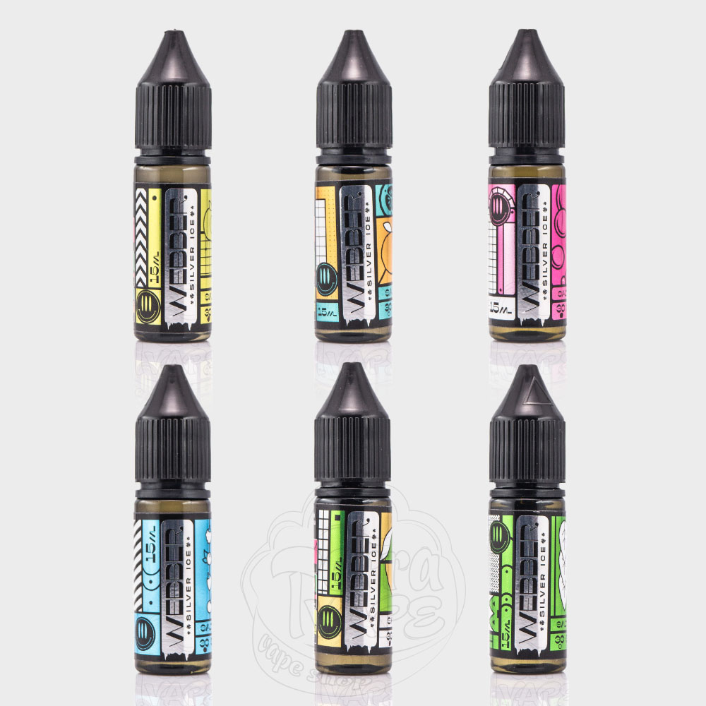 Webber Silver ICE Salt 15ml - це рідина для под систем з охолоджуючим ефектом від відомої української компанії UA E-Juice. Об'єм пластикового флакона складає 30мл або 15мл, а дизайн етикетки відповідає стилістиці виробника. Як і завжди, на упаковці міститься інформація про співвідношення смаків у відсотках, а також показаний рівень холодку. Кількість гліцерину та пропілену співвідноситься як 50/50, що створює ідеальну густоту для якісного просочення картриджів та випарників для багаторазових POD-систем. Градація міцності має два ступені:
