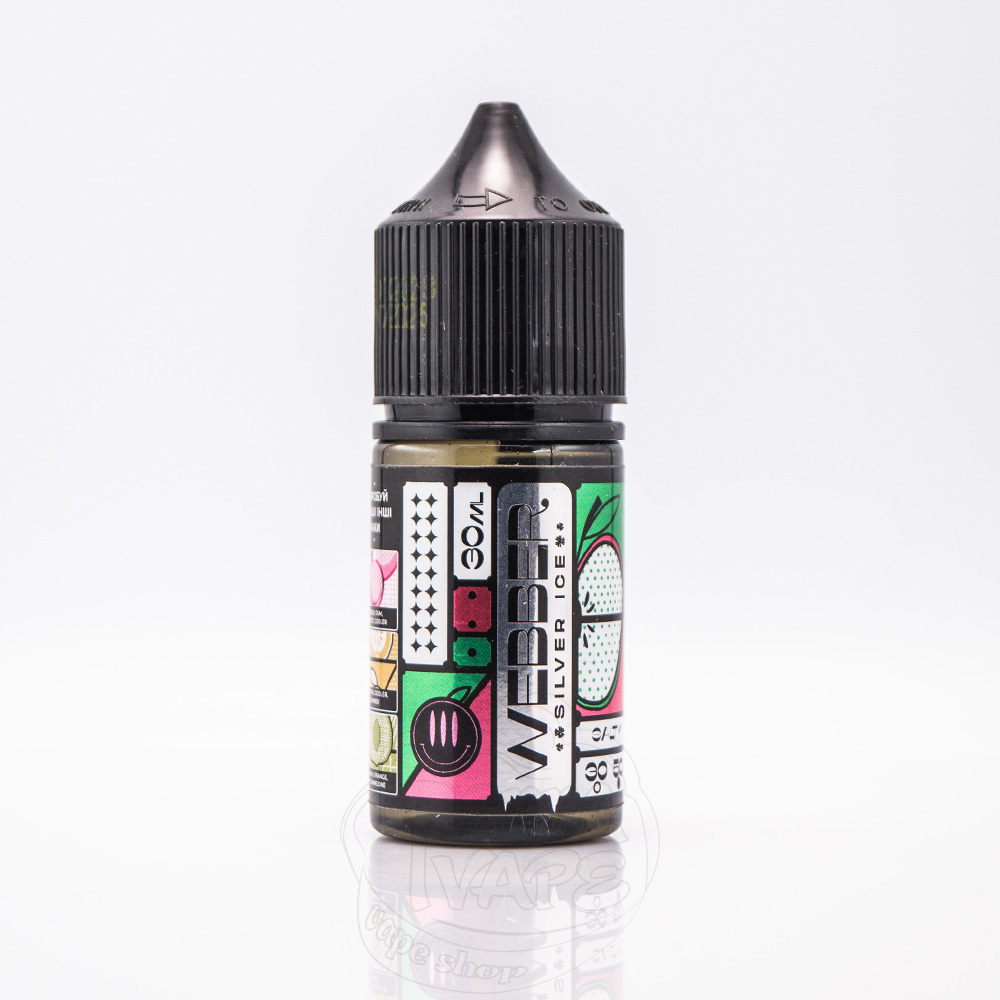 Webber Silver ICE Salt 30ml - це серія рідин з холодком від українського виробника з багаторічним досвідом UA E-Juice. Постачаються у пластиковому флаконі ємністю 30мл або 15мл. Впізнаваний зовнішній вигляд етикетки за традицією містить інформацію про співвідношення смаків у відсотках, а також відображається рівень наявного охолоджуючого ефекту. На відміну від класичної лінійки, дизайн став більш абстрактним та наводить на думку про смак тільки за допомогою кольору.