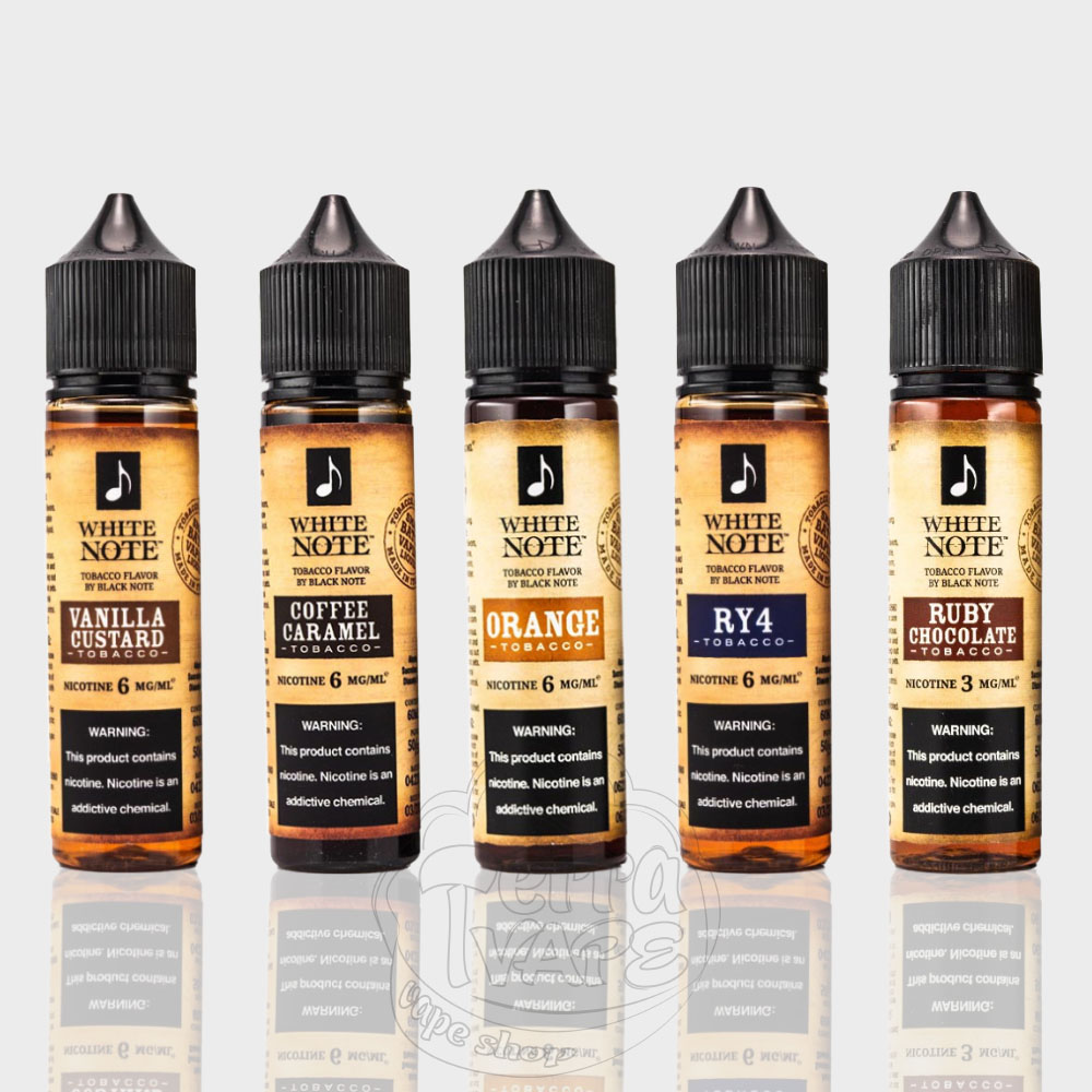Особливість White Note полягає у її складі. Ця рідина виготовлена з оригінального екстракту тютюну різних сортів та відрізняється найвищою якістю і смаком. На відміну від Black Note, яка містить виключно чисті тютюнові смаки, дана серія натхненна фруктами та ароматами з усього світу. Насолоджуйтеся тютюновими рідинами зі смаком солодкого мексиканського лікеру Калуа, рожевого швейцарського шоколаду, соковитого сицилійського апельсина, ванільних бобів з Мадагаскару, а також нотами підсмаженого мигдалю.
