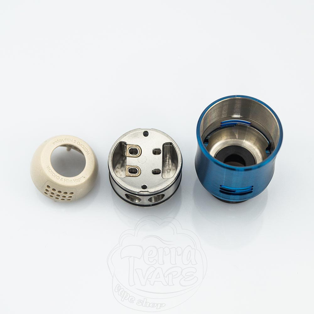 На кожній стороні корпусу є три ряди широких отворів для забору повітря, а також ви отримуєте два адаптери для обдуву, які застосовуються для посилення смаку. Кожен з цих адаптерів має три ряди по 5 отворів, але вони відрізняються за кількістю місця, яке залишають на деці. Однин адаптер розрахований на односпіральні конструкції і залишає менше місця на деці, тоді як інший буде ширшим і призначений для намоток з двома спіралями. Такий перехідник встановлюється прямо на деку і розташовується над нагрівальним елементом та навколо нього. Таке впровадження є абсолютно інноваційним. У той час як більшість RDA на дві спіралі добре функціонують лише з двома елементами через великий розмір бази, такі адаптери миттєво обмежують простір і сприяють відмінній передачі смаку.