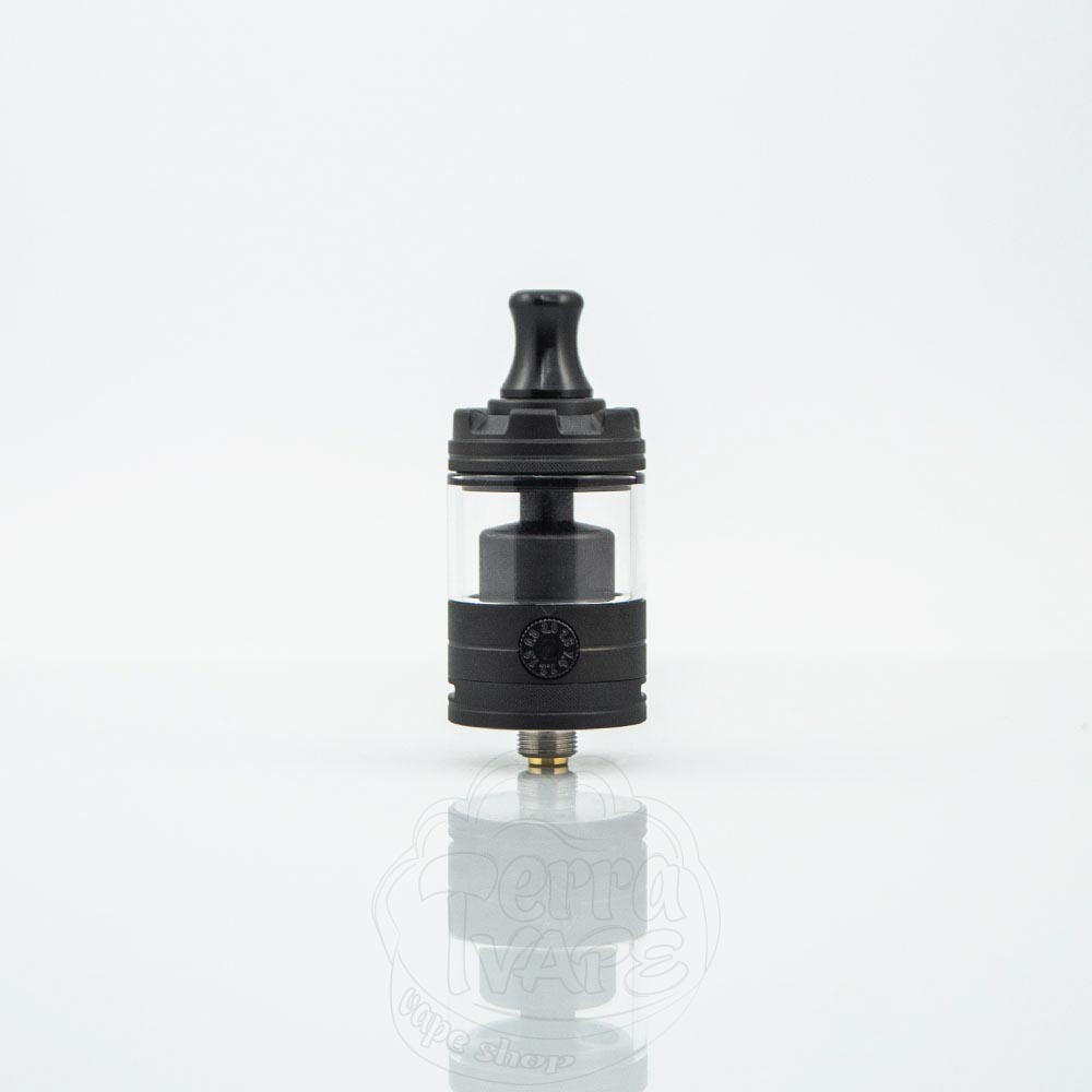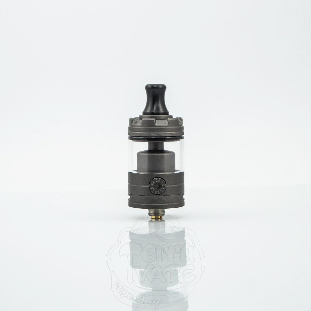 Бак имеет скромные размеры: высота составляет 48мм, а диаметр – 22мм. Вверху расположился сменный 510 дрип-тип. Крышка заправки имеет выступы, напоминающие силуэт шестеренки, благодаря чему обеспечивается очень удобный хват. Открывается в четверть оборота, предоставляя доступ к широким отверстиям для заправки.