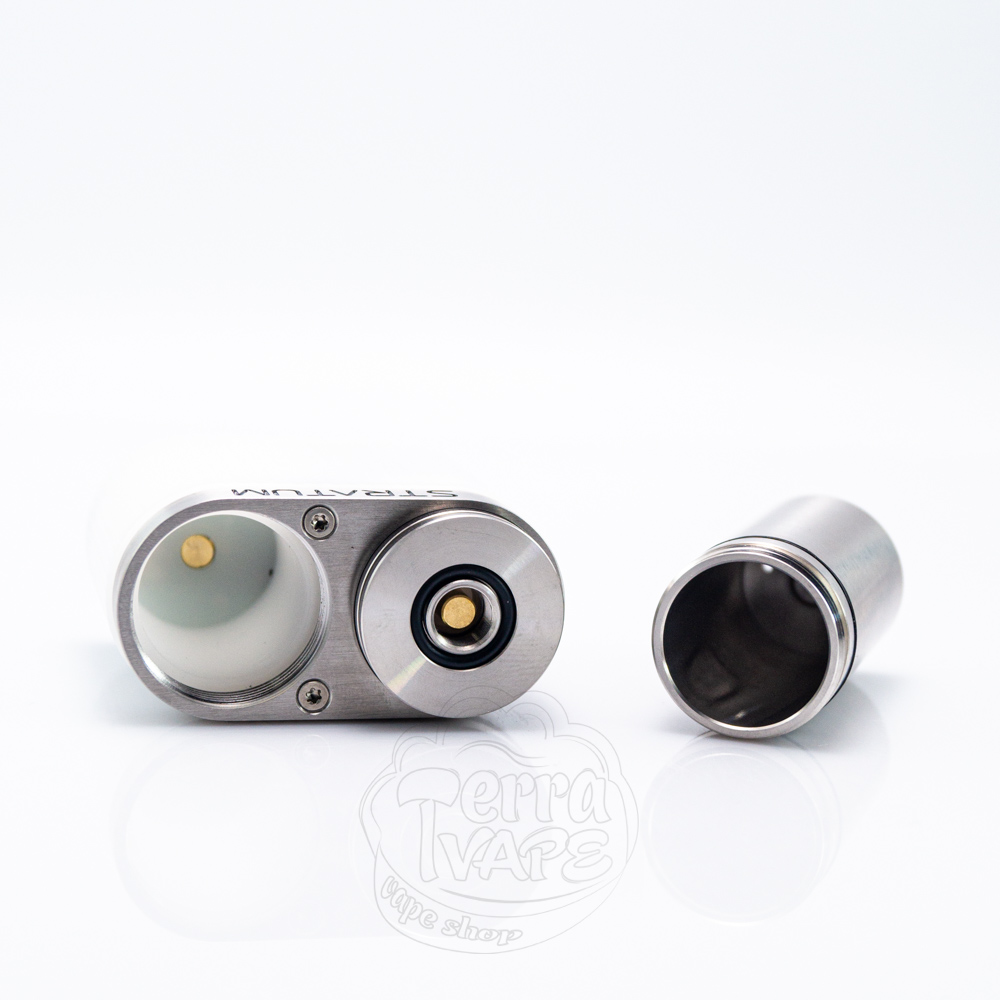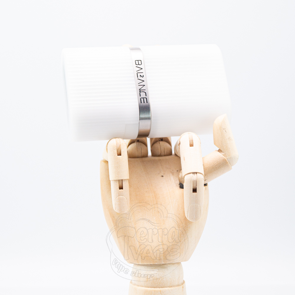 Що стосується зовнішнього вигляду електронної сигарети, дві частини корпусу розділяє металева пластина, яка, власне, і тримає батарейний відсік та платформу для розміщення атомайзера. На цій пластині можна побачити невелике брендування, яке дуже влучно вписується у дизайн та виглядає стильно. Це написи "Stratum" з одного боку та "Balance 2" з іншого. Під цією металевою вставкою є ледь помітна кнопка, яка повторює форму корпусу, але гладка на дотик. Саме вона і відповідатиме за активацію девайсу, простіше кажучи, це кнопка Fire. На дні пристрою знаходиться невеликий екран овальної форми, дещо зміщений вліво від центру.