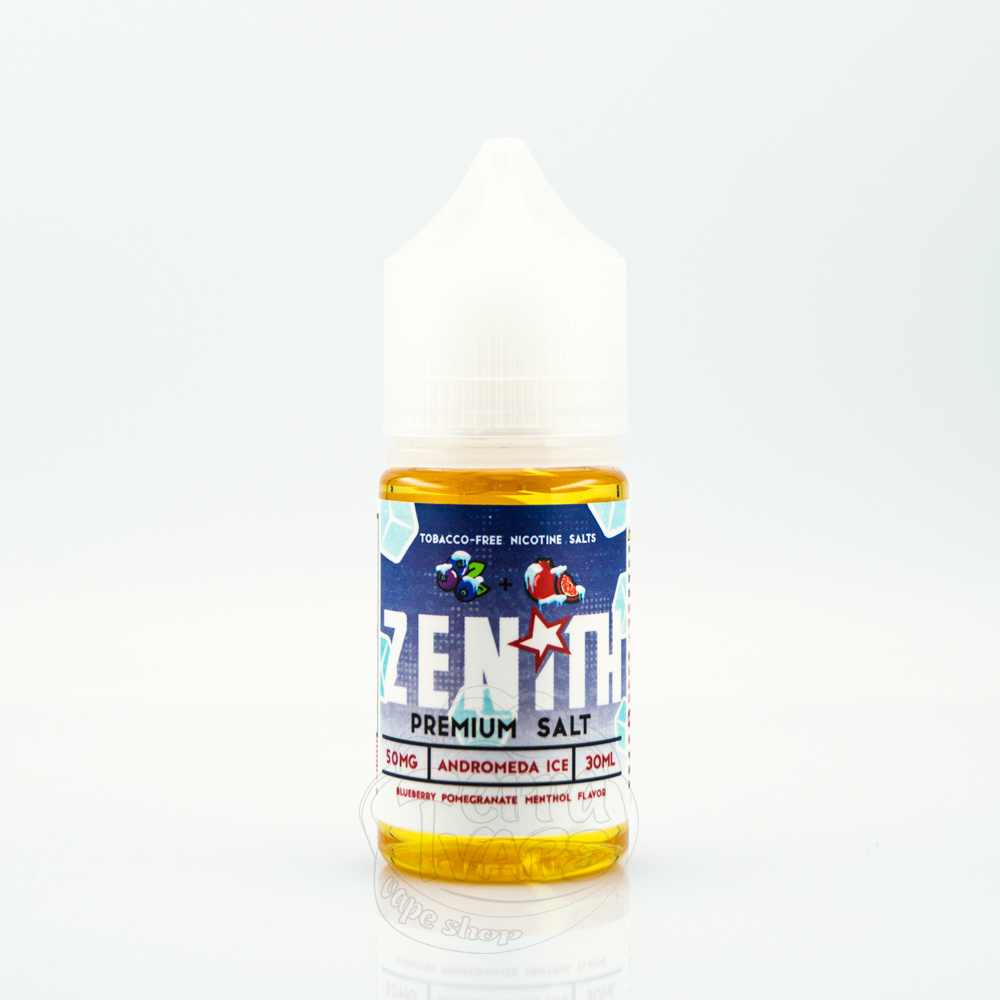 Zenith Salt Andromeda Ice 30ml 50mg - це рідина на сольовому нікотині з ягідним смаком стиглої чорниці та терпкого граната з холодком.